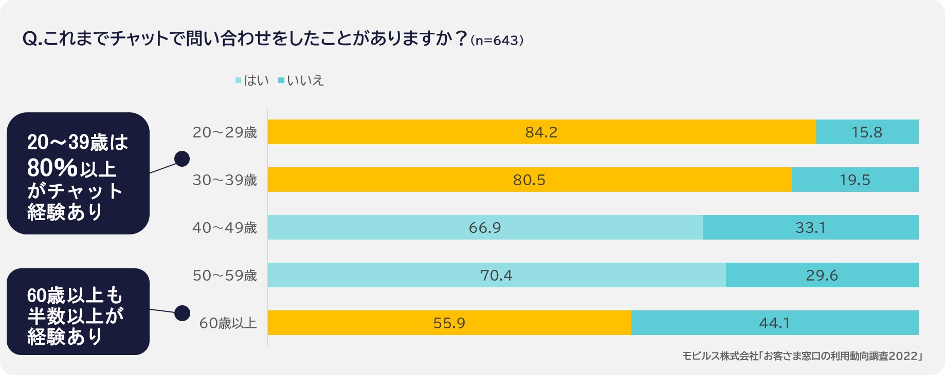 チャットでの問い合わせ経験を年代別に見たところ、20~39歳は80%以上の人が経験ありと回答しました。また、意外にも60歳以上も55.9%と半数以上が経験ありと回答し、年代に関わらず問い合わせ手段としてチャットの利用が浸透してきている結果でした。