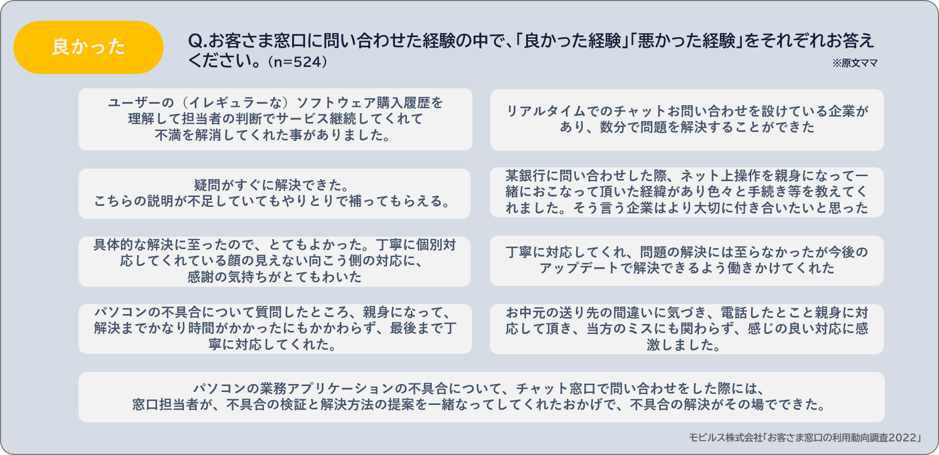「疑問がすぐに解決できた」「要望をくみ取ってくれて、丁寧に親身に対応してくれた」「聞いたこと以上の情報を教えてくれた「意図をくみ取ってくれた」「解決はしなかったが丁寧な対応で信頼できた」といった「人ならでは」の良さが多かったです。