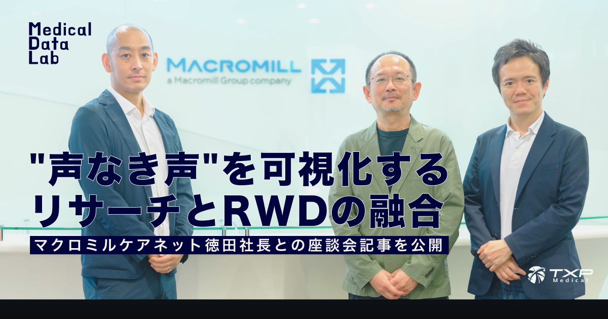 TXP Medical株式会社(本社:東京都千代田区、代表取締役CEO:園生智弘、以下TXP Medical)は、株式会社マクロミルケアネット(本社:東京都港区、代表取締役社長:徳田茂二、以下マクロミルケアネット)と共同で、医療・ライフサイエンス領域におけるリアルワールドデータとリサーチの融合をテーマとした取り組みを開始しました。今後さらに重要視されるPatient Centricityの実現には「プライマリーリサーチで得られるインサイト」と「RWDが示すファクト」の融合が不可欠です。