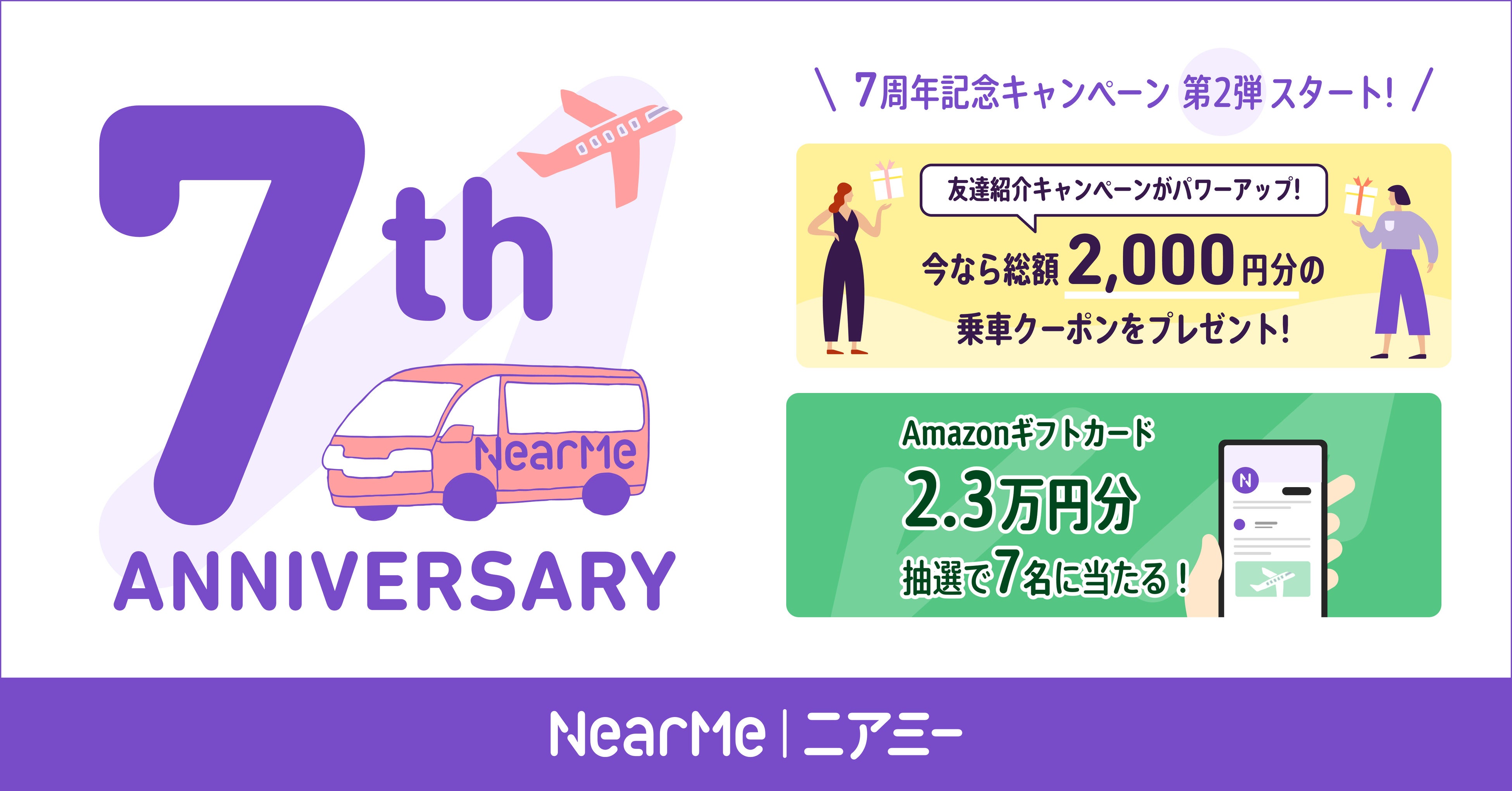 「ニアミー7周年感謝キャンペーン」は、創業7周年を記念して、全部で7つのキャンペーンを展開いたします。来たる旅行シーズンに向けて、ユーザーの皆さまにより様々なシチュエーションでニアミーの“シェア乗り”をご利用いただくため、さまざまな特典をご用意しています。キャンペーン第2弾となる今回は、更なる“シェア乗り”の輪を広げていくために、対象期間中のお友達紹介およびサービスの利用で、紹介者に通常1,000円オフのところを総額2,000円分オフのクーポンを贈呈。お友達には、利用者数77万人突破にちなんで、キャンペーン第1弾で配布を開始した、特典①の新規ユーザー限定77%オフクーポン2枚と合わせて、総額6,000円分のクーポンをプレゼントする友達紹介キャンペーン強化(特典④)を実施いたします。また、第1弾特典③に引き続き、ニアミーの公式X(@nearme_jp)をフォローの上、公式Xの特定の投稿を「#シェア乗り」を記載頂いた上で引用リポスト頂いた中から抽選で7名様に対してニアミーの社名にちなんで今回は2.3万円分のAmazonギフト券をプレゼントいたします(特典⑤)。