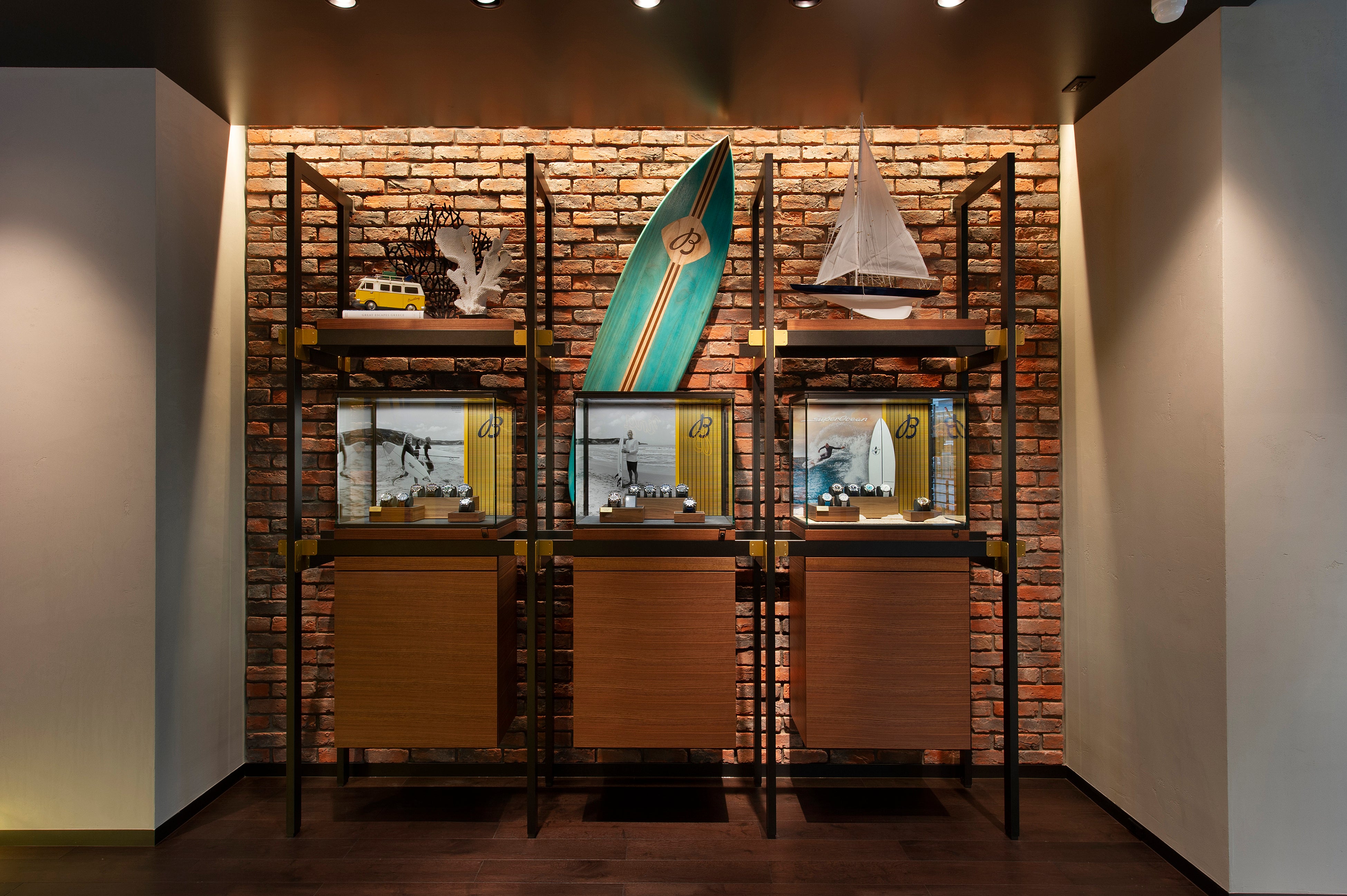 通りに面したウィンドウには最新のヴィジュアルを掲示。店内演出は全世界のブライトリング ブティック同様に、ブライトリング独自の最新デザインコンセプト、インダストリアル・ロフトを採用しています。ヴィンテージ感のある内装にハンドクラフトの家具を配し、モダンレトロな雰囲気に。足を運んでいただけるお客様に、寛いでいただける環境を大切にしています。陸海空にまたがるブライトリング製品のフィールドを感じさせる空間で、ブライトリングの世界観を存分に堪能していただけることでしょう。最新のディスプレイには、新作から希少なブティック限定モデルまで幅広い時計が展示され、圧倒的な品揃えを誇ります。ブライトリング社による研修を受けた経験豊かなスタッフが在籍し、 時計の専門知識だけでなく高いホスピタリティを併せ持つスペシャリストがお客様をお迎えします。