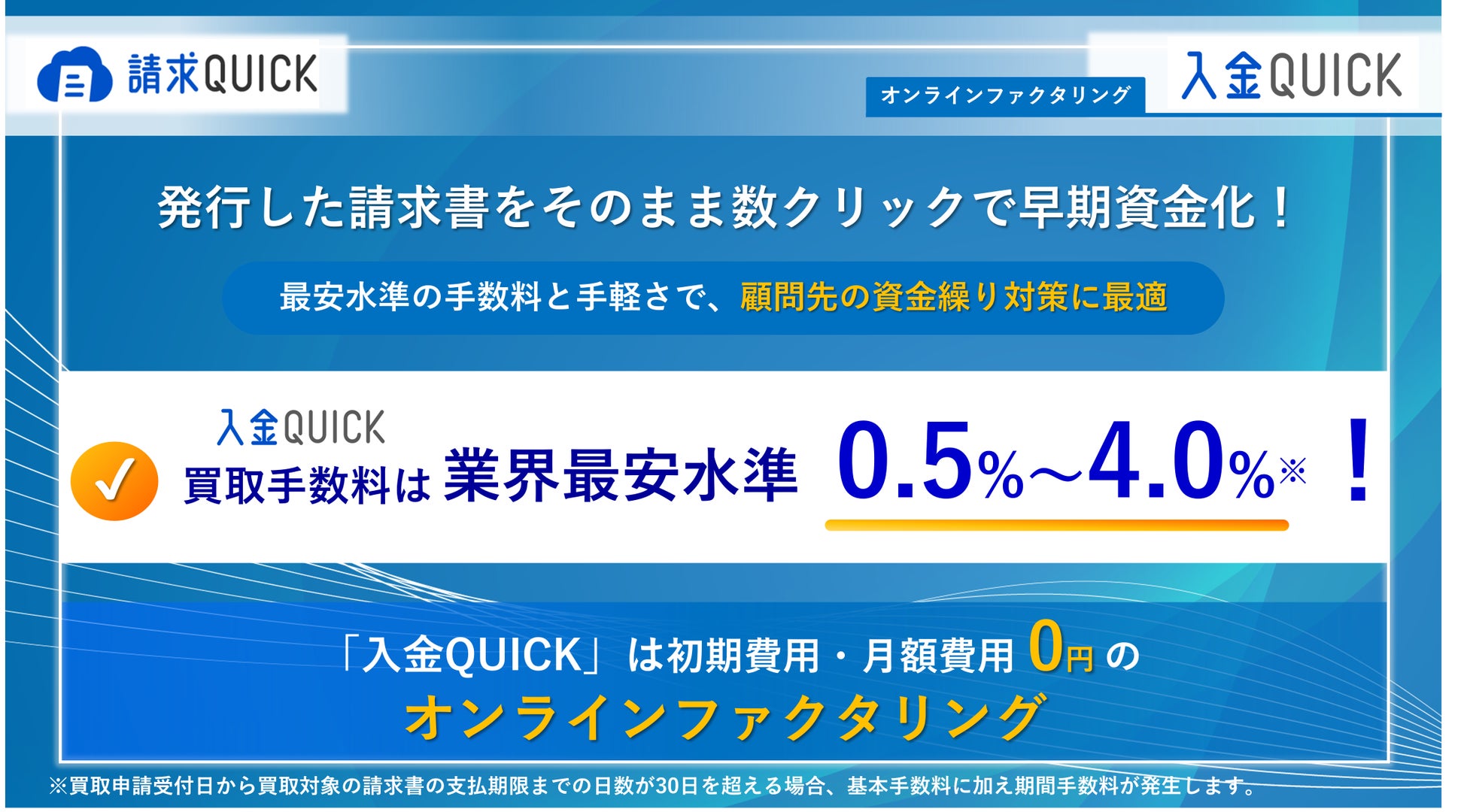 本セミナーでは、顧問先の資金繰り課題を解決するオンラインファクタリングサービス「入金QUICK」のご紹介と、税理士・会計事務所様向けの「紹介パートナープログラム」のご案内をいたします。「入金QUICK」は中小企業の資金調達の常識を変えることを目指し、業界最安水準の手数料0.5%~4.0%*1で提供するオンラインファクタリングサービスです。
