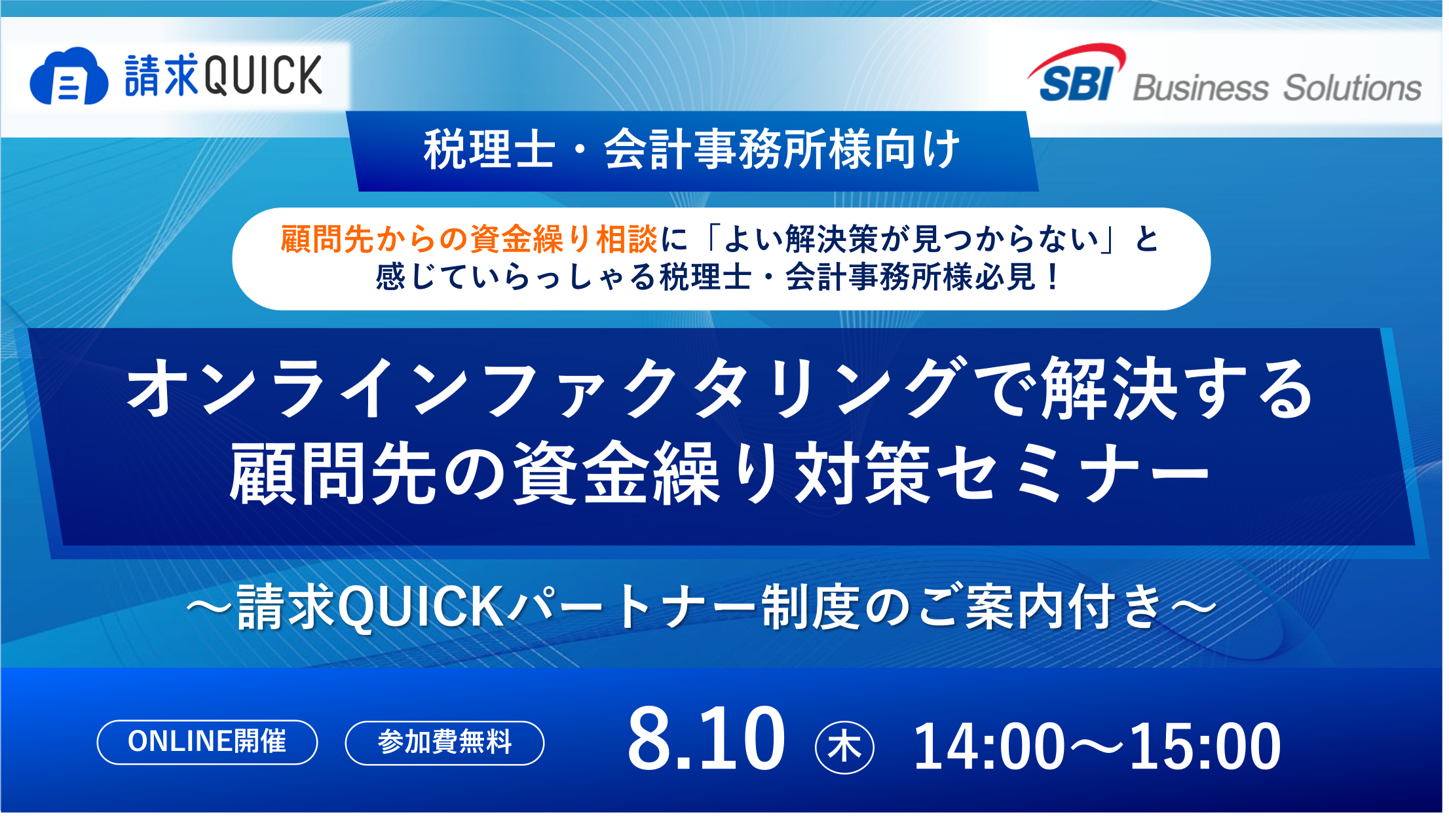 【税理士・会計事務所様向け】 オンラインファクタリングで解決する顧問先の資金繰り対策セミナー ~請求QUICKパートナー制度のご案内~ |