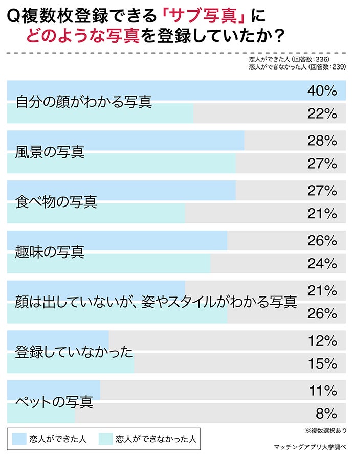 恋人ができた人たちに8%多かったものが、「自分や友人が撮影した、自分の顔がわかる写真」です。一方で、恋人ができなかった人たちが6%多かったものが、「顔は出していないが自分の姿やスタイルがわかる写真」でした。