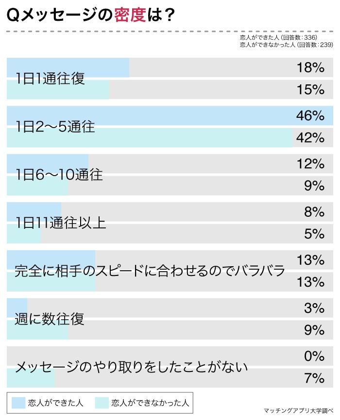 差がついている項目は「週に数往復」のゆっくりペースのコミュニケーションです。恋人ができた人の方がコミュニケーションの量自体が少し多い結果となりました。