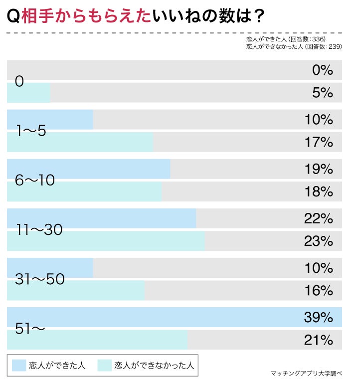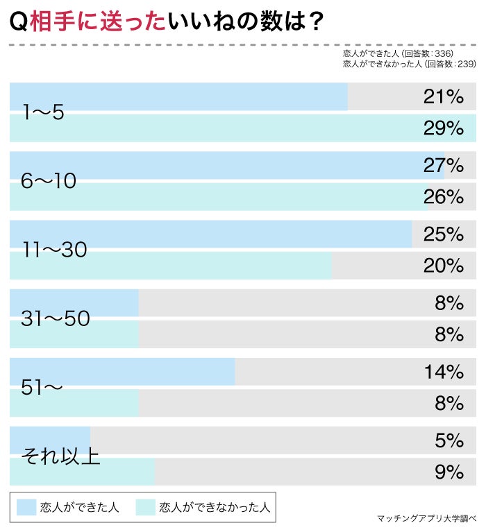 ここに関しては想像通り、恋人ができた人の方が多くいいねを送っていました。それぞれ一番多かった項目をみると、恋人ができた人は6〜10人にいいねを送っており、恋人ができていない人は5人以下でした。