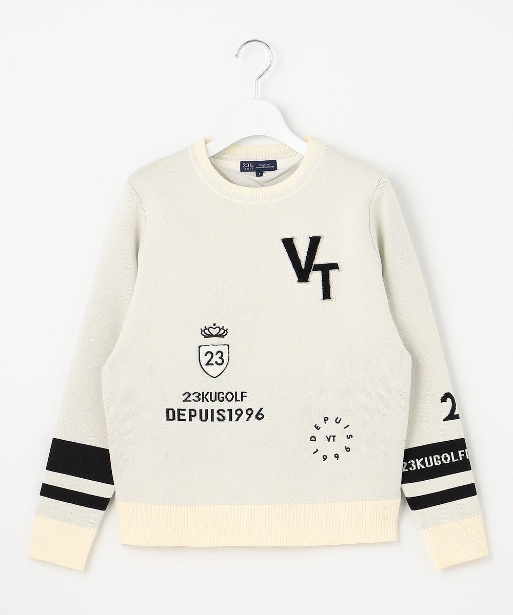 『23区GOLF』では冬のゴルフにぴったりなグラフィックニットを販売中です。複数のロゴを配したカジュアルなデザインで、ほどよい厚みと肉感があり、ストレッチ性と軽量性を兼ね備えているため、ゴルフでのアクティブな動きにもしっかりと対応します。