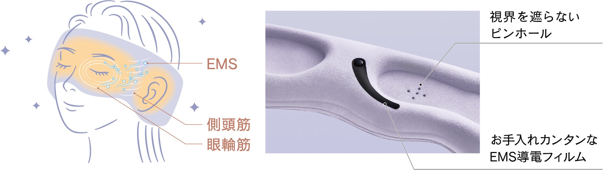 EMS導電フィルムを目もとに配し、表情を作る眼輪筋と側頭筋にダイレクトにアプローチしケアします。視界を完全に遮らないピンホールは、EMSのオンオフの操作がしやすい仕様です。