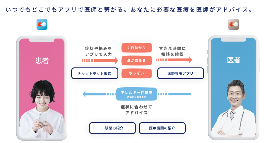 24時間365⽇スマホで医師に相談ができるアプリです。現在300⼈以上の医師が登録されており、外出⾃粛等により病院 やクリニックに⾏きにくい⽅もアプリを通じて医師に気軽に相談することができます。