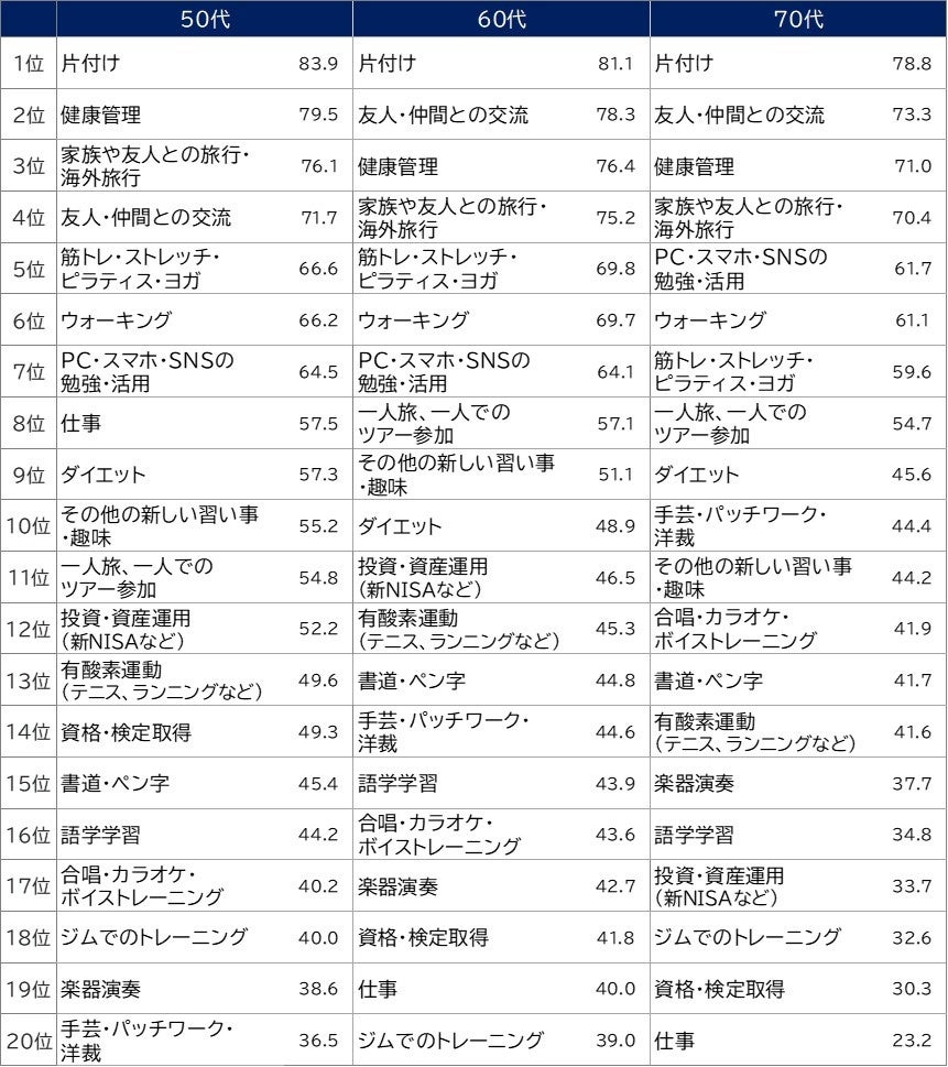 これまでやっていないが、今年になって始めたい人が多かったのが「一人旅、一人でのツアー参加」。60・70代で8位に入った。コロナの収束、子供の独立や伴侶との別れなどをきっかけに、人に気を遣わず自由に旅したいという声が目立った。
