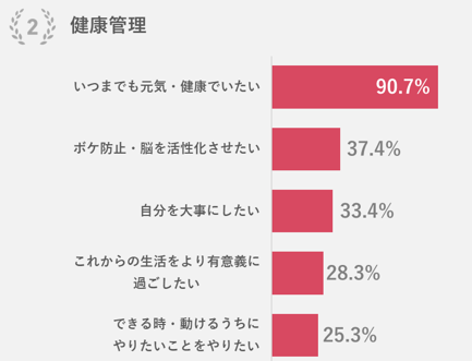 理由1位は「いつまでも元気・健康でいたい」。運動や趣味の充実を通して心身を健康にしたいという声が多かった。