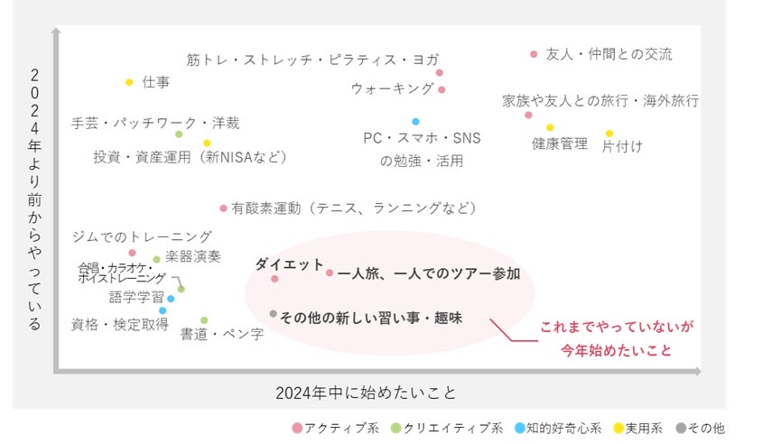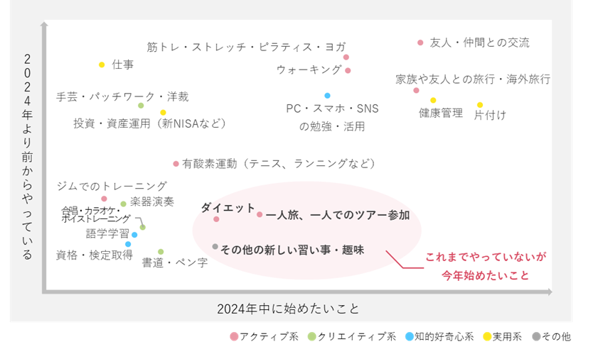 ・ピンク色の網掛け部分は、2024年より前からやっている人が少なく、2024年になって始めたい人が多い「一人旅、一人でのツアー参加」「ダイエット」「その他の新しい習い事・趣味」であった。
