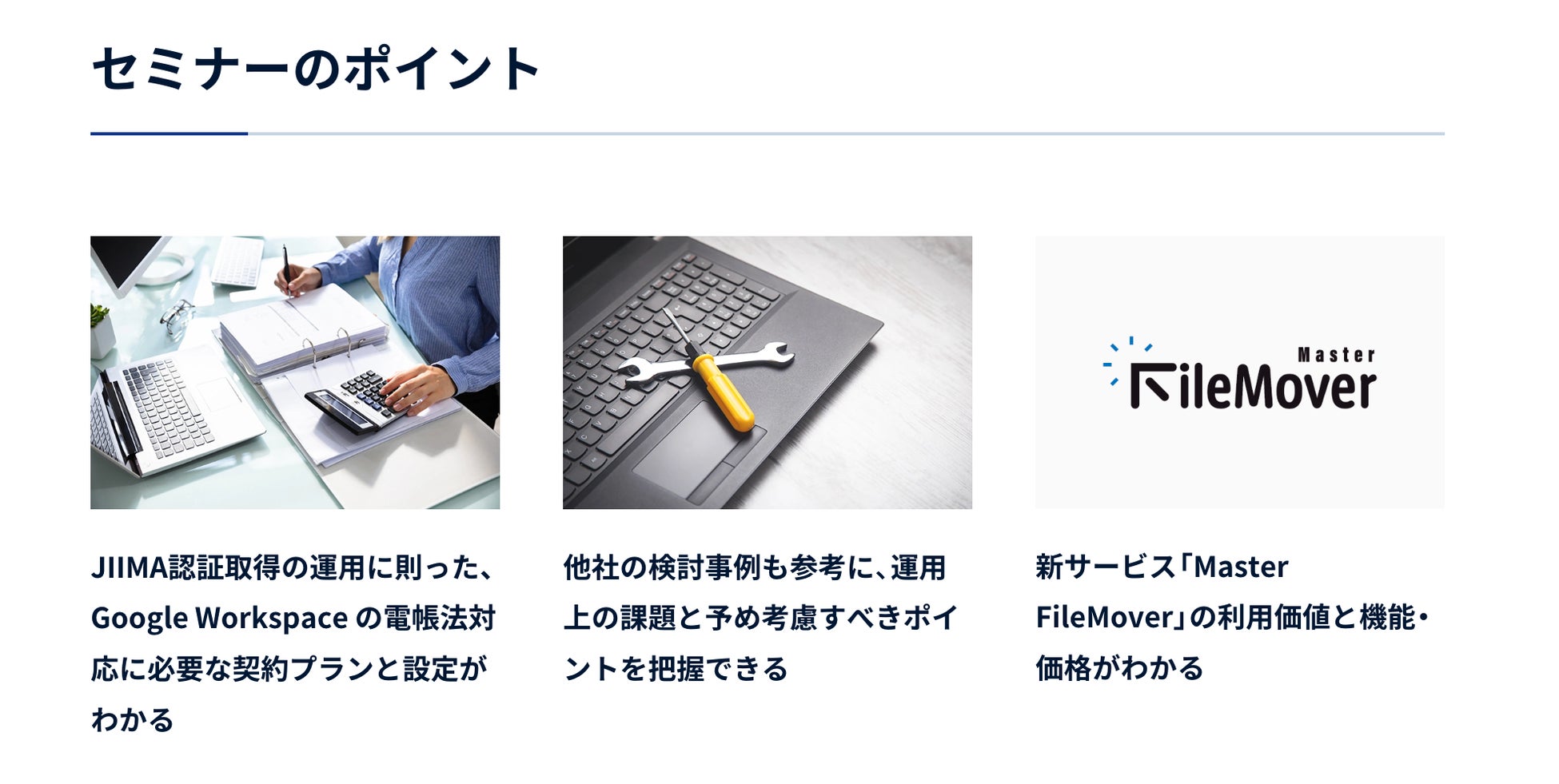 また、Google Workspace による電帳法対応を検討する企業のニーズを基に独自開発した、新サービス「Master FileMover」の概要や導入メリットをご紹介します。