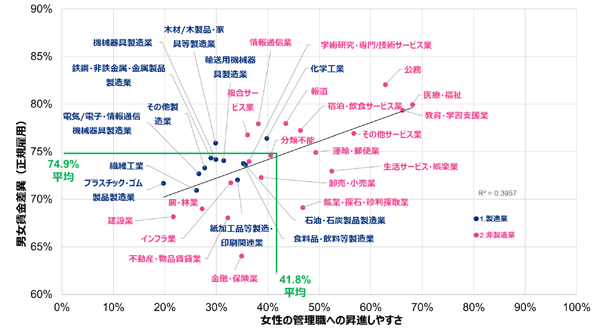 まず、業種別の傾向として2023年のレポートと同様、女性の管理職への昇進しやすさと男女の賃金差異には正の相関があり、女性が昇進しやすい企業ほど、賃金差異が小さい傾向にあります。また、業種間の比較では多少のばらつきはあるものの、非製造業・サービス業は製造業に比べ女性が管理職へ昇進しやすく男女の賃金差異が小さい傾向が見られました。