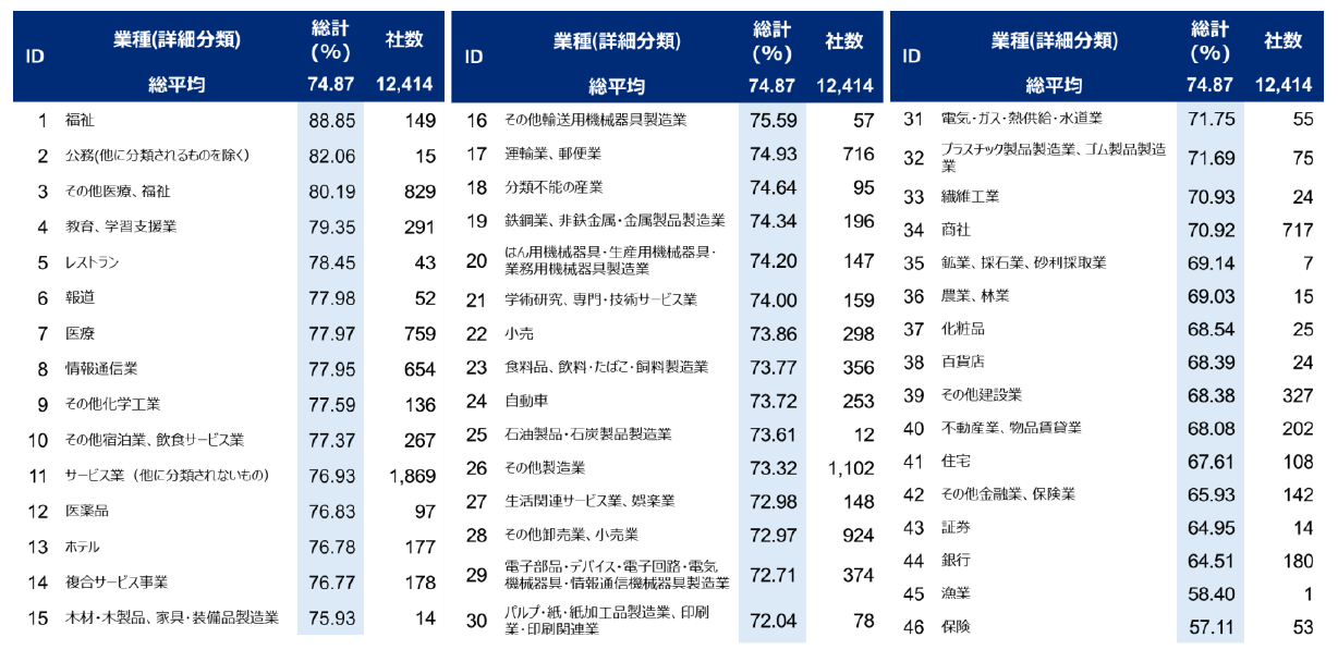 業種別の傾向も昨年と大きく変わりませんでした。特徴として、保険・銀行などの金融業では差異が大きく、教育・医療業で差異が小さい傾向が見られます。
