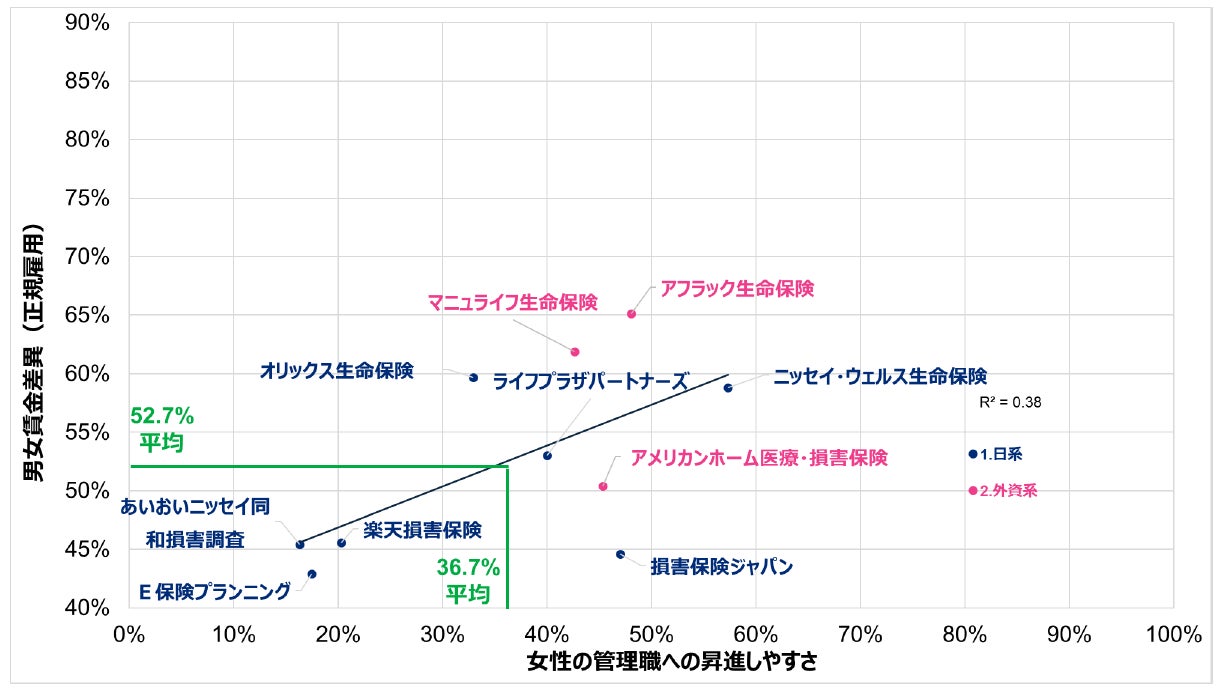 続いて、業種別の比較において男女賃金差異が大きい業種である「保険」業・301人以上の企業分布を見てみます(図3)。多少のばらつきや数の違いはあるものの、日系企業と外資系企業を比較すると、外資系企業の方がより女性が管理職に昇進しやすく、男女賃金差異も小さいように見えます。保険業界の男女賃金差異が大きい主な要因に、一般職・総合職等の男女の雇用区分の違いによるものが挙げられますが、各社の数字の違いは、性別の違いと雇用区分が強く紐づいている日本的な雇用形態を残している企業と、そのような区分を設けない企業の違いとも考えられます。どのような特徴を持つ企業がグラフのどこに位置しているのかを把握できれば、自社が目指すべき姿が見えてくるかもしれません。