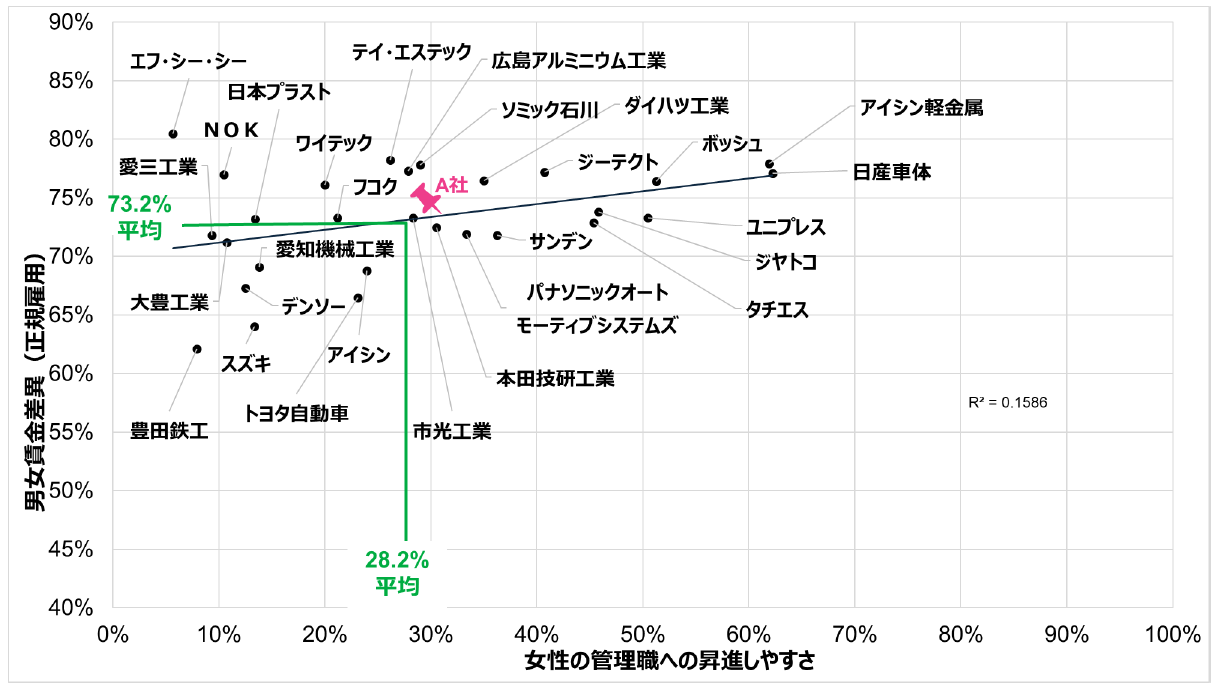 次に、男女賃金差異の業種詳細平均が全社平均に近い「自動車」業・1,001人以上の企業の分布を掘り下げます(図2)。例えば、ある自動車メーカーA社(女性の管理職への昇進しやすさ:30.0%、正規雇用社員の男女賃金差異:75.0%)のデータを同グラフにプロットすると、A社は同業種内では女性の管理職への昇進しやすさ・正規雇用社員の男女賃金差異ともに「自動車」業種・1,001人以上の企業の平均(女性の管理職への昇進しやすさ:28.2%、正規雇用社員男女賃金差異:73.2%)を上回っていることが確認できます。さらには、自社よりも女性が管理職に昇進しやすく男女賃金差異が小さい企業名が確認できるため、自社の女性活躍推進施策を検討する際のベンチマーク企業の選定に役立てられます。また近年では、製造業が製品に関連するソフトウェア開発やITサービスを事業に取り込むケース等、事業が多様化している場合もあるため、事業構造の変化に合わせて比較対象とする業種や企業も見直しをしながらベンチマークを実施することが望ましいでしょう。