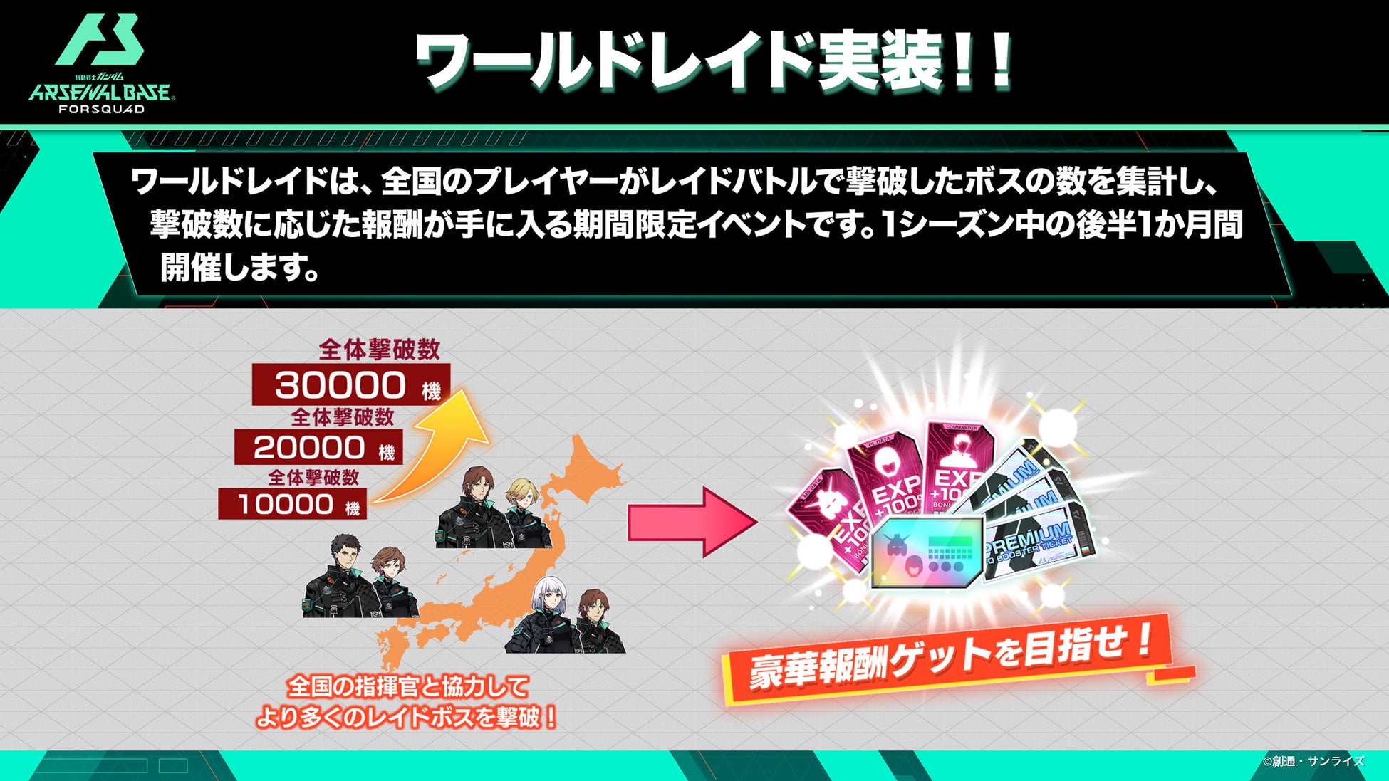 全国のプレイヤーが撃破したレイドボス数を集計して、指揮官全員でクリアを目指すイベント「ワールドレイド」が新たに実装されます。撃破数の合計数に応じて報酬も豪華になっていきますので、より多くのレイドボスを倒して、豪華報酬GETを目指しましょう。