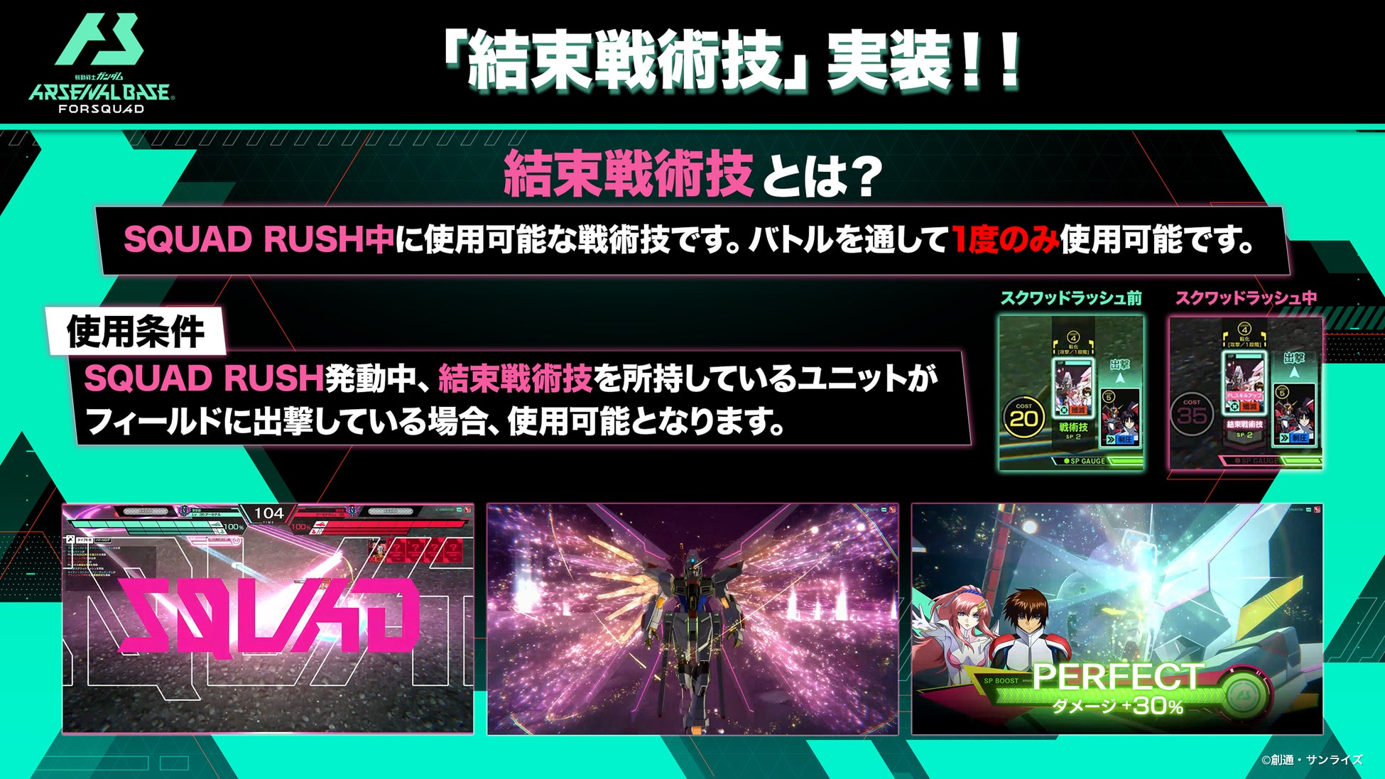 FORSQUAD SEASON:01では、『機動戦士ガンダムSEED FREEDOM』をはじめ、『機動戦士Gundam GQuuuuuuX』(ジークアクス)『機動戦士ガンダム0083 STARDUST MEMORY』からMS/PLが大量参戦!さらにゲーム内の大型アップデートで、出撃ユニットに様々な恩恵を与える「SQUAD RUSH」、SQUAD RUSH中に一度のみ発動できる強力な戦術技「結束戦術技」などが新たな要素として登場!