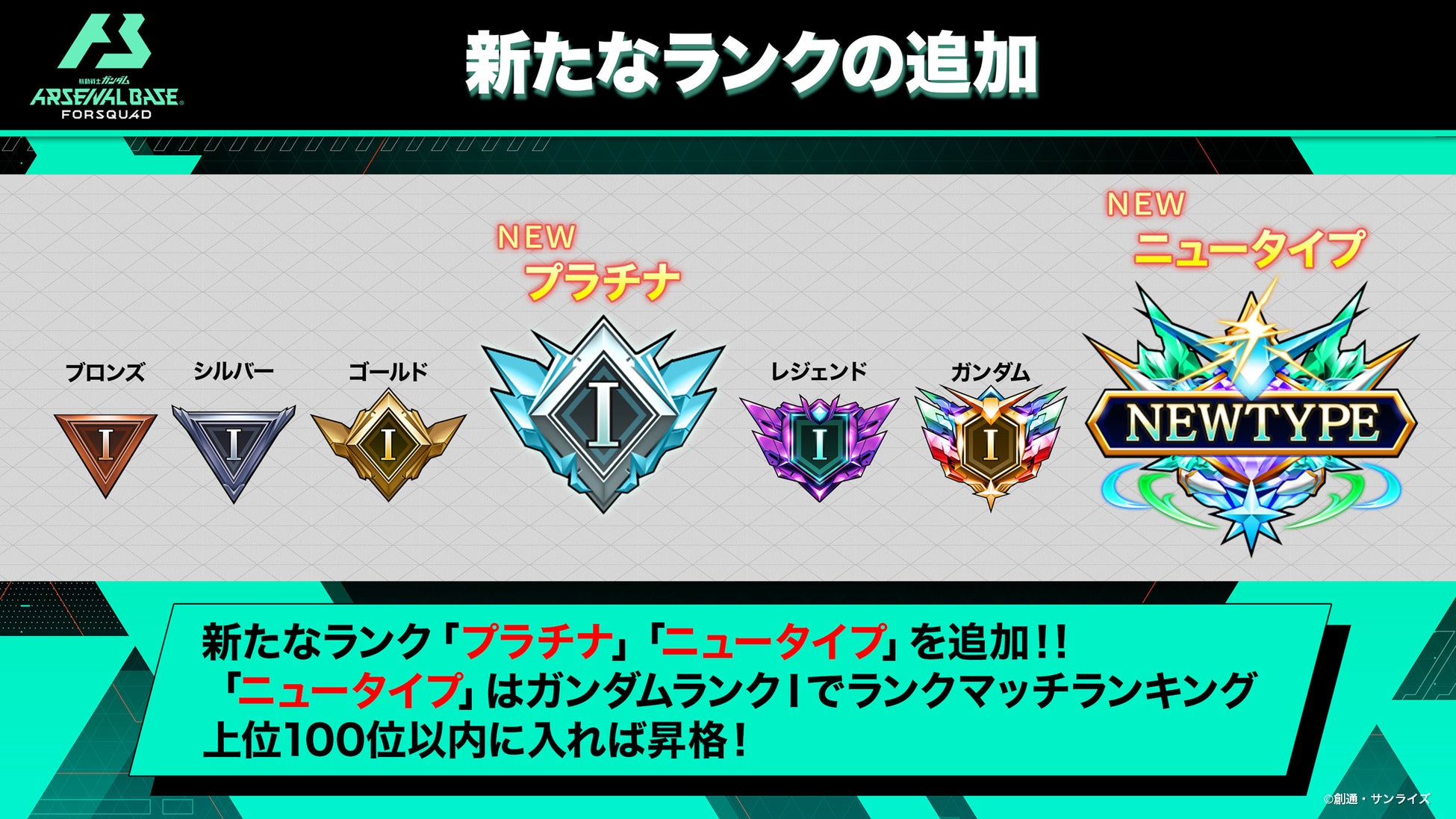 ランクマッチに新たなランク「プラチナ」と、ランクマッチランキング上位100位以内に入るともらえる「ニュータイプ」が追加されます。