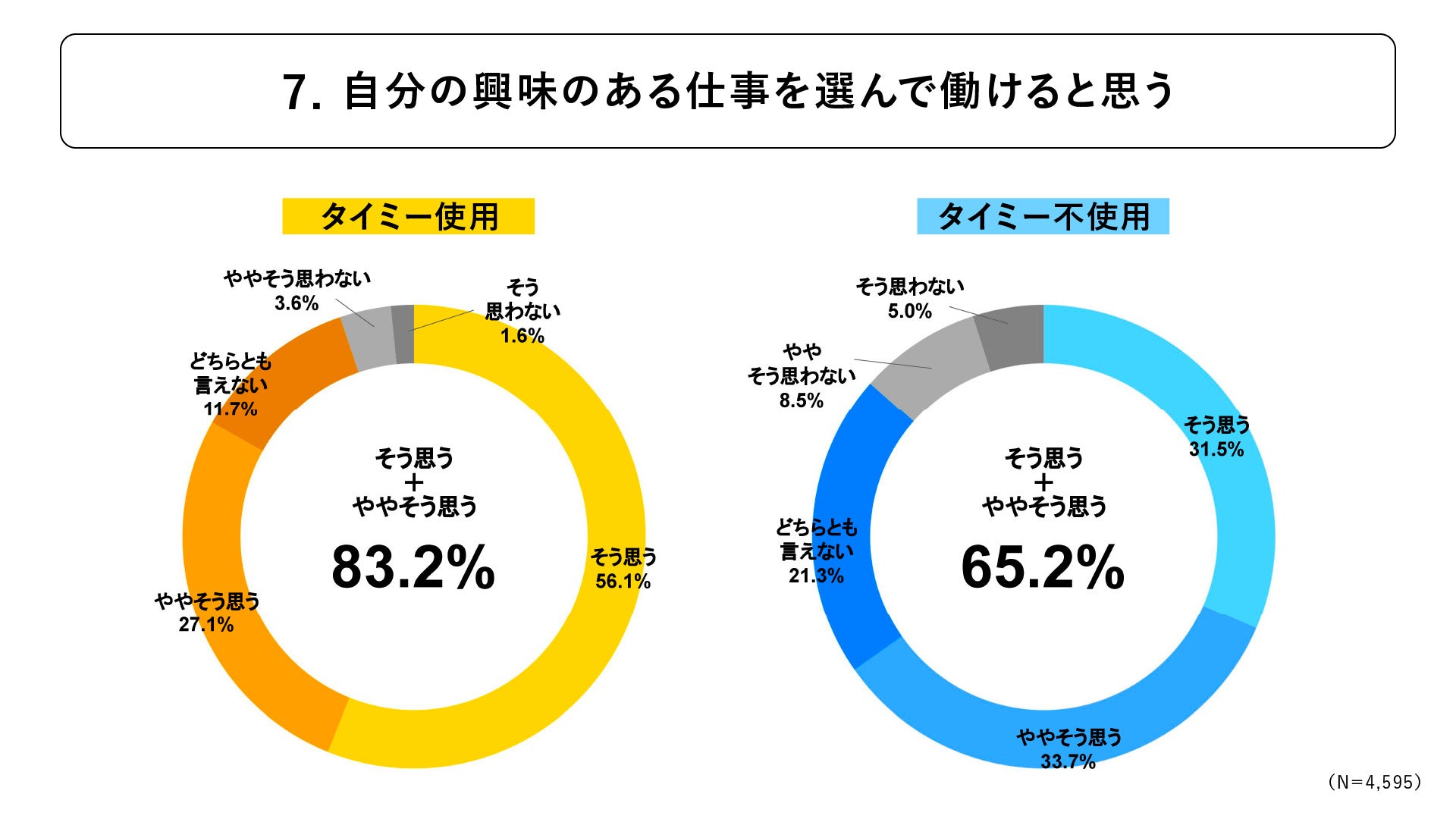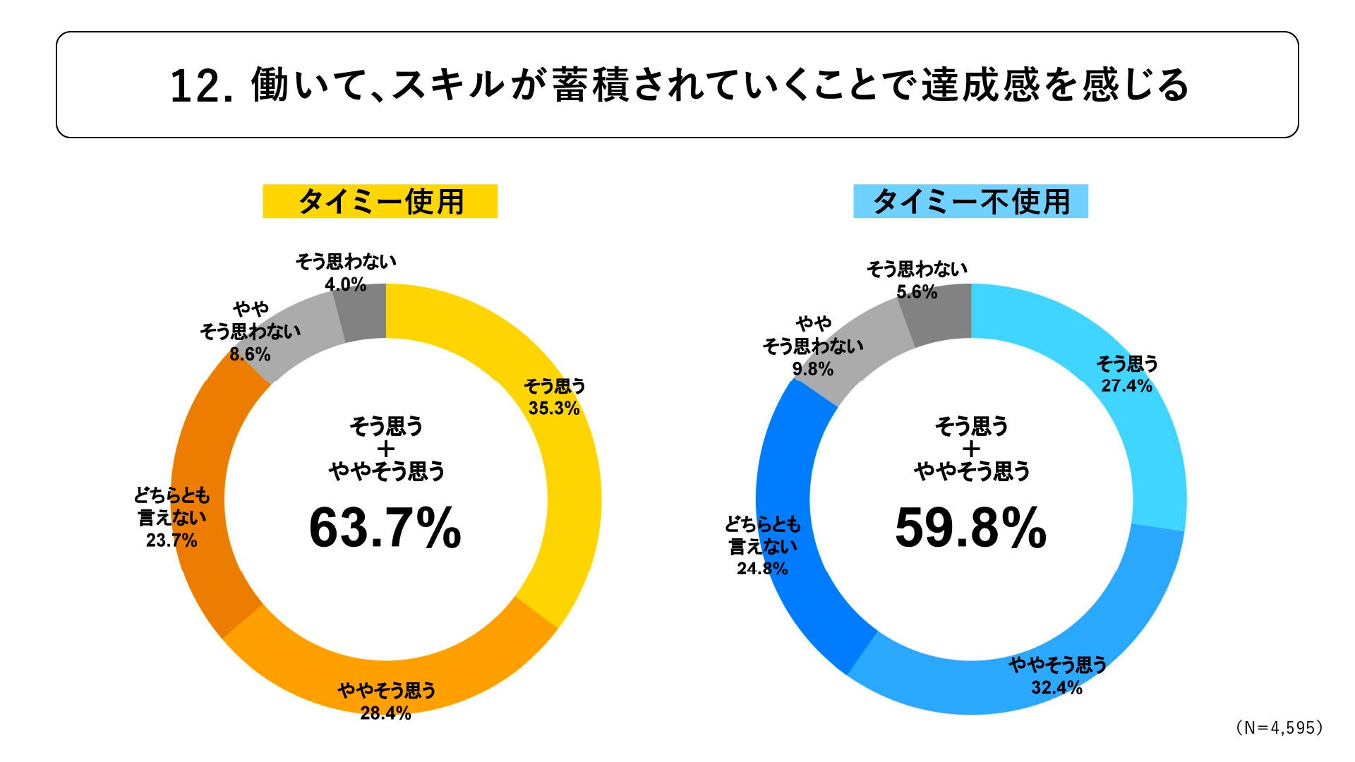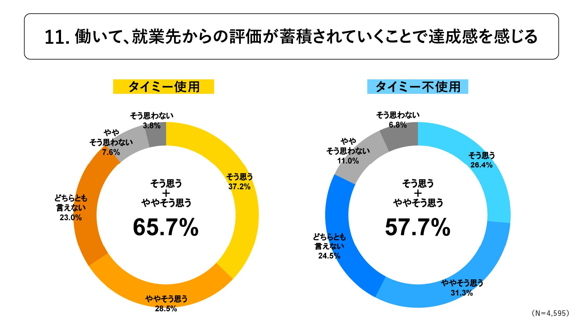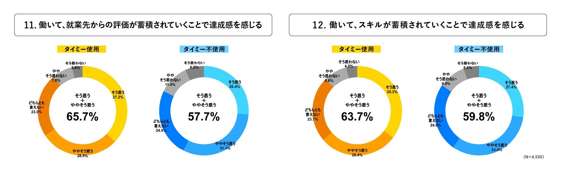 本調査の結果、「働いて就業先からの評価が蓄積されていくことで達成感を感じる」、「働いてスキルが蓄積されていくことで達成感を感じる」の項目にて、「タイミー不使用」よりも「タイミー使用」の方がポイントが高くなっている実態が明らかになりました。スキマバイトなどの単発アルバイトは、「単発の稼働がゆえに、スキルや評価が蓄積されづらい」などのイメージを持たれていましたが、そうした従来のイメージを覆す結果となりました。スキマバイトによって、働き手の方にもたらされる便益の新たな一面となることが期待できます。