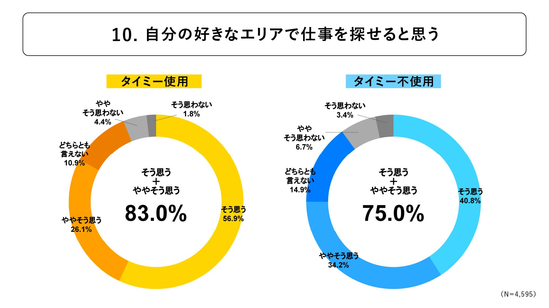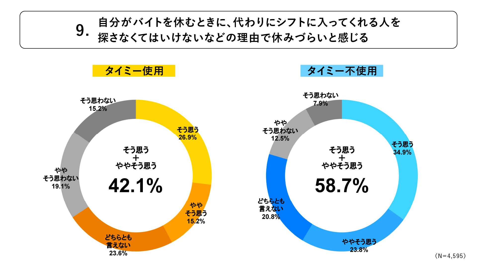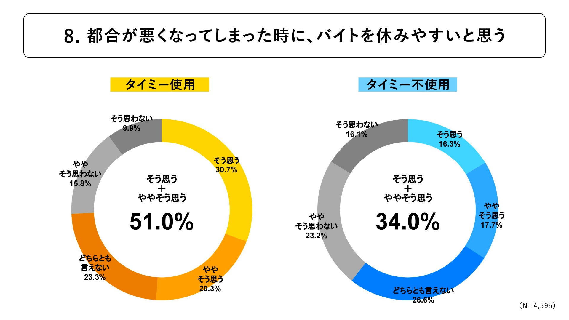 また、「都合が悪くなってしまった時に、バイトを休みやすいと思う」などの「休み」に関する項目でも、「タイミー」による便益を感じていただけている結果となりました。「タイミー」では、キャンセルポリシーに基づきキャンセルされた時間に応じてポイントが付与される「ペナルティポイント」の仕組みを導入しています。働き手の方からは、「曜日固定のシフトだと子供の行事が入った際に休みづらいが、タイミーならキャンセルしても他の方がマッチングしてくれるから安心できる」といった声をいただくなど、改めて【タイミーを使用して勤務したアルバイト】において利便性を感じていただいている実態も判明しました。