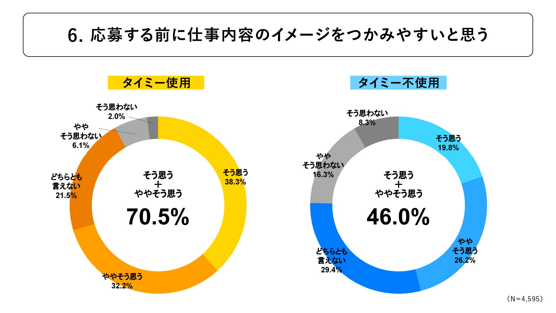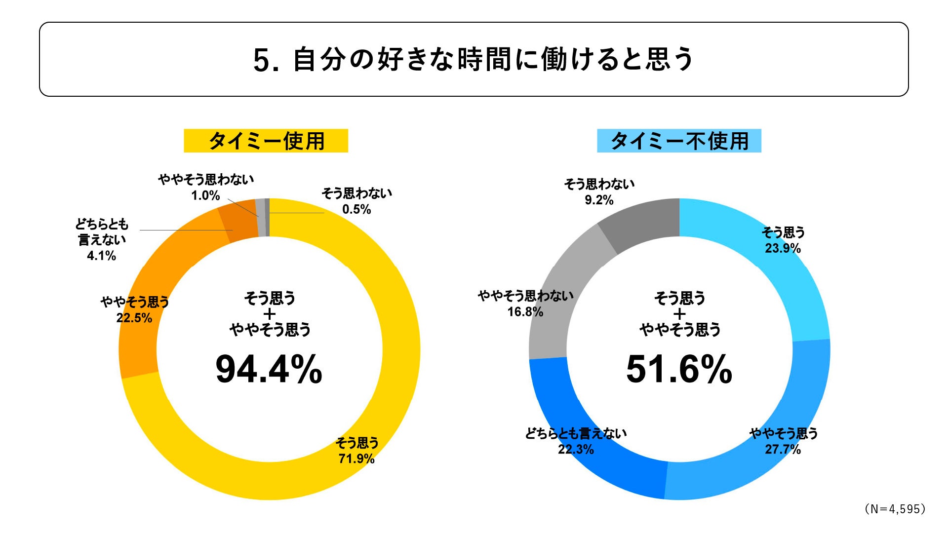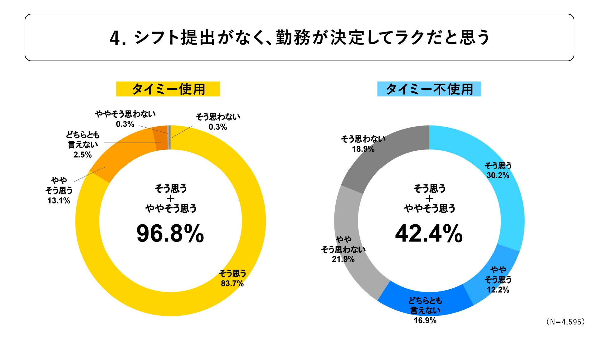 また、「都合が悪くなってしまった時に、バイトを休みやすいと思う」などの「休み」に関する項目でも、「タイミー」による便益を感じていただけている結果となりました。「タイミー」では、キャンセルポリシーに基づきキャンセルされた時間に応じてポイントが付与される「ペナルティポイント」の仕組みを導入しています。働き手の方からは、「曜日固定のシフトだと子供の行事が入った際に休みづらいが、タイミーならキャンセルしても他の方がマッチングしてくれるから安心できる」といった声をいただくなど、改めて【タイミーを使用して勤務したアルバイト】において利便性を感じていただいている実態も判明しました。
