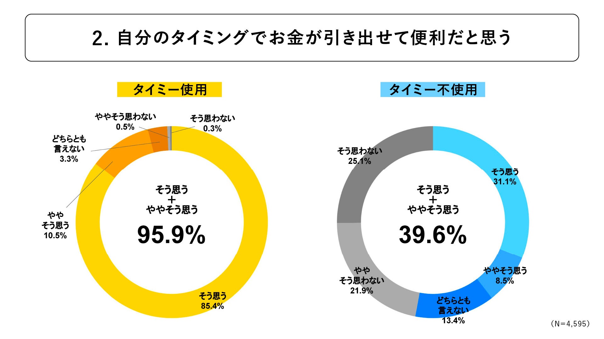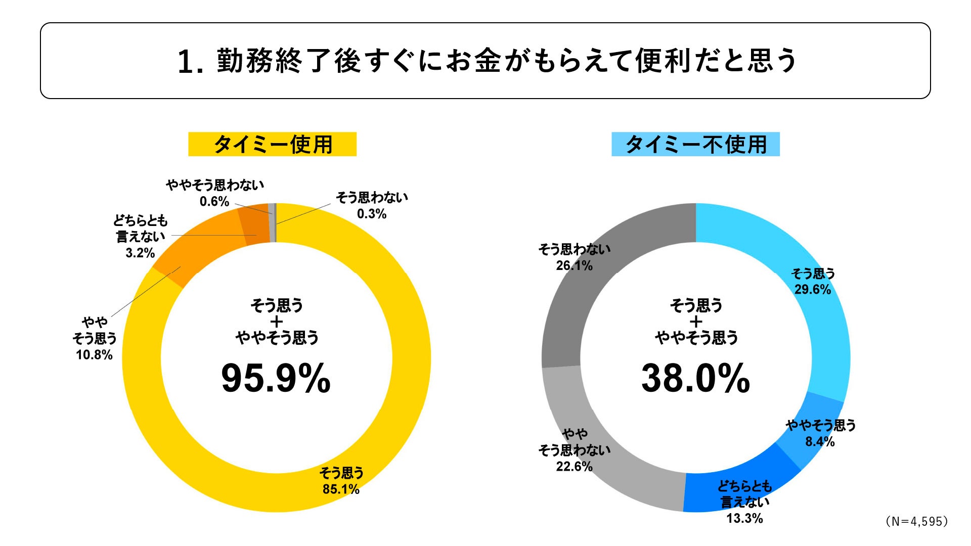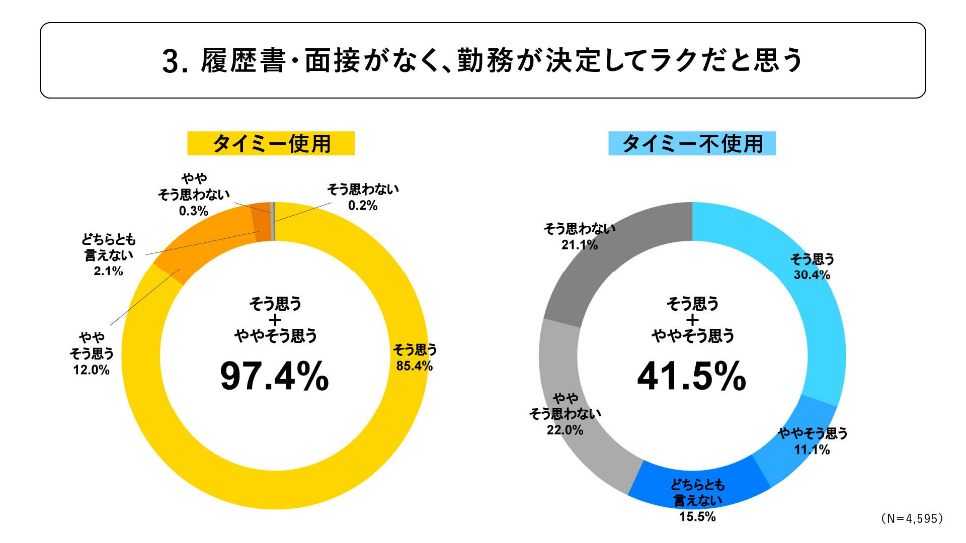 「タイミー」の特徴である「すきな時間に働ける」、「履歴書・面接なし」、「すぐお金がもらえる」に該当する項目にて、95%以上の方に“そう思う”、“ややそう思う”と回答いただいています。