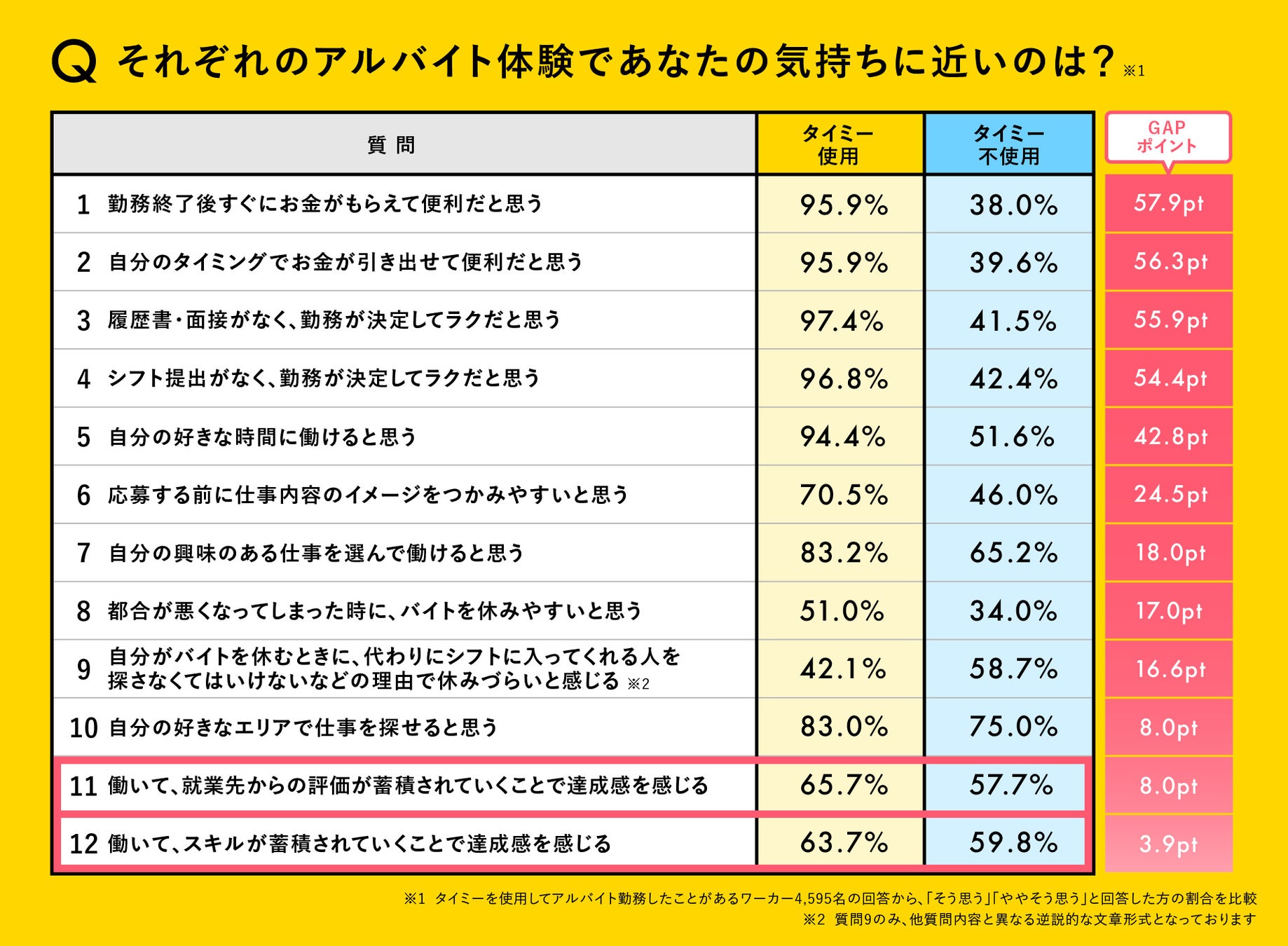 本調査では、アルバイト勤務における12項目の様々なシチュエーションについて、【タイミーを使用して勤務したアルバイト】(以降、タイミー使用)と、【タイミーを使用しないで勤務したアルバイト】(以降、タイミー不使用)それぞれの共感度合いを回答していただきました。
