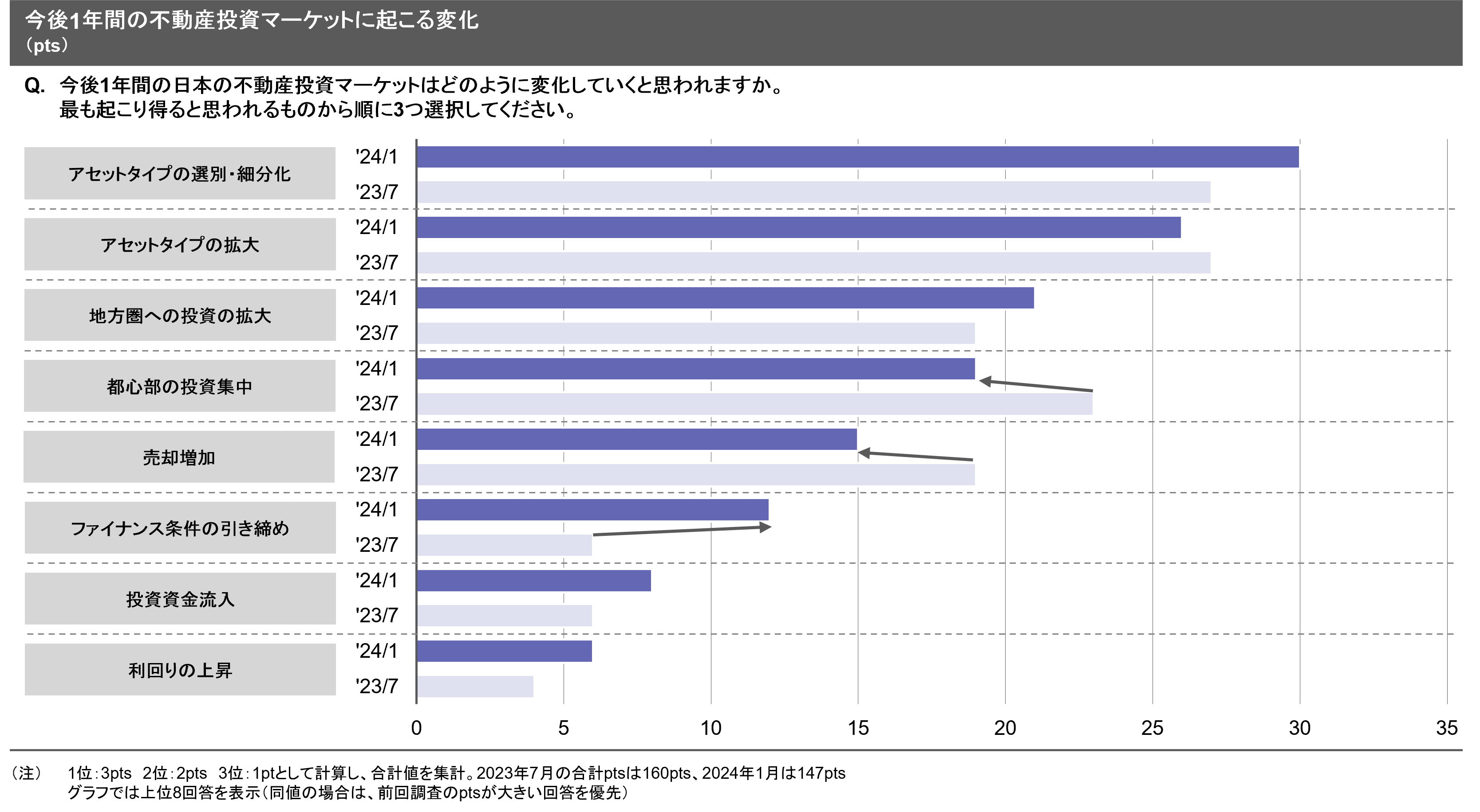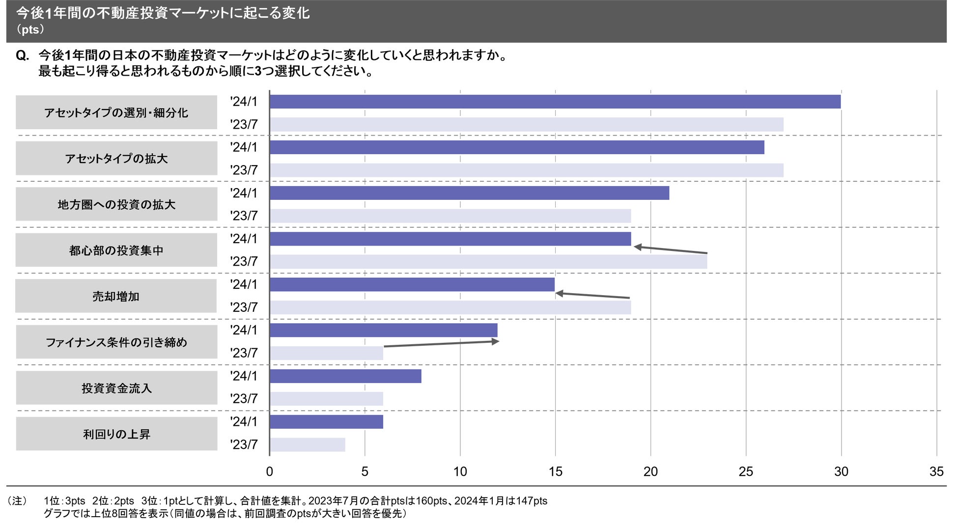今後1年間の不動産投資マーケットに起こる変化としては、「アセットタイプの選別・細分化」、「アセットタイプの拡大」、「地方圏への投資の拡大」等が上位回答となった。その他、今回調査では、「ファイナンス条件の引き締め」が増加、「都心部への集中」、「売却への増加」が減少した。