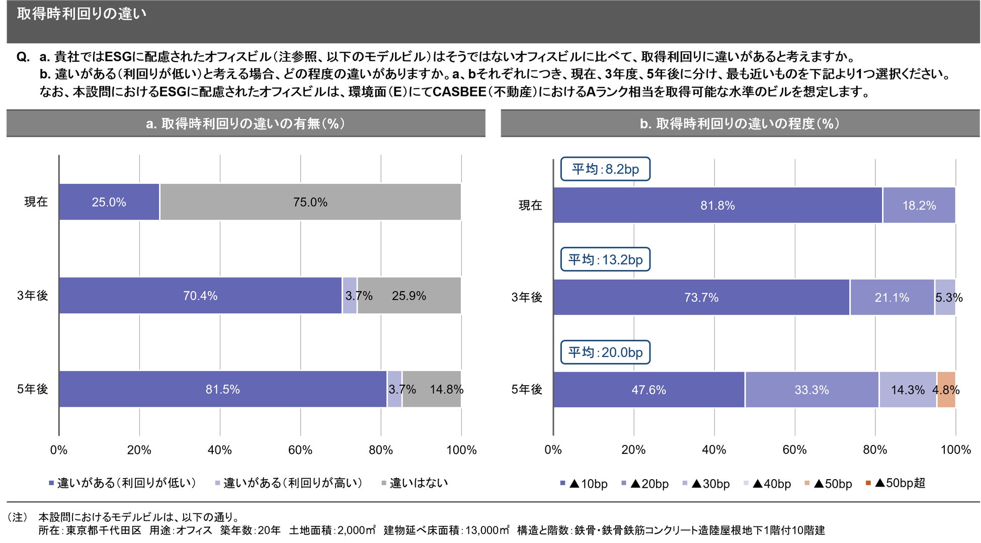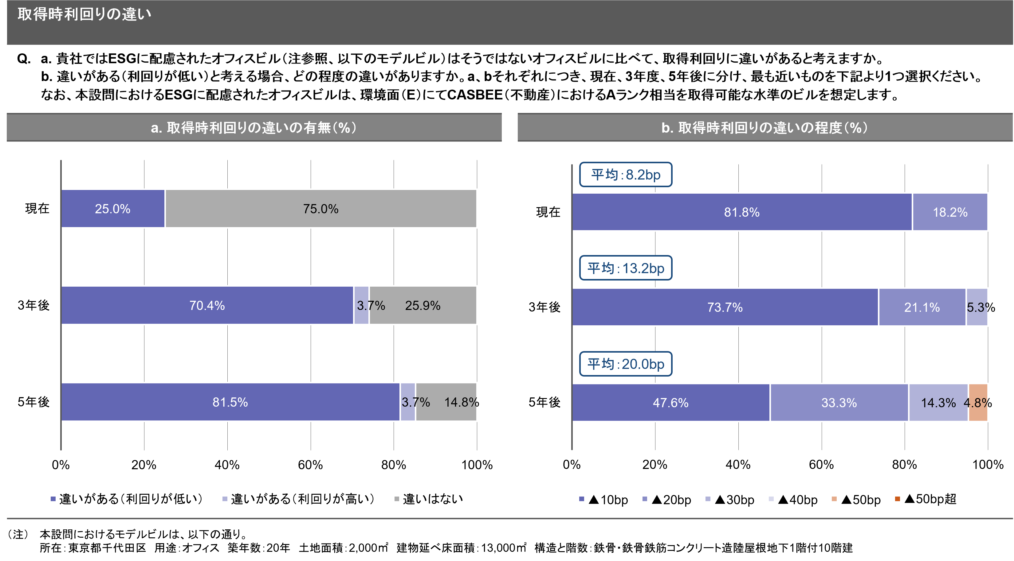 ESGに配慮されたビルとそうではないビルの取得時利回りについて、現時点において「違いがある(利回りが低い)」の割合は25.0%に止まるものの、3年後には70.4%、5年後には81.5%となった。取得時利回りの違いの程度については、将来時点ほど大きくなることが確認された。