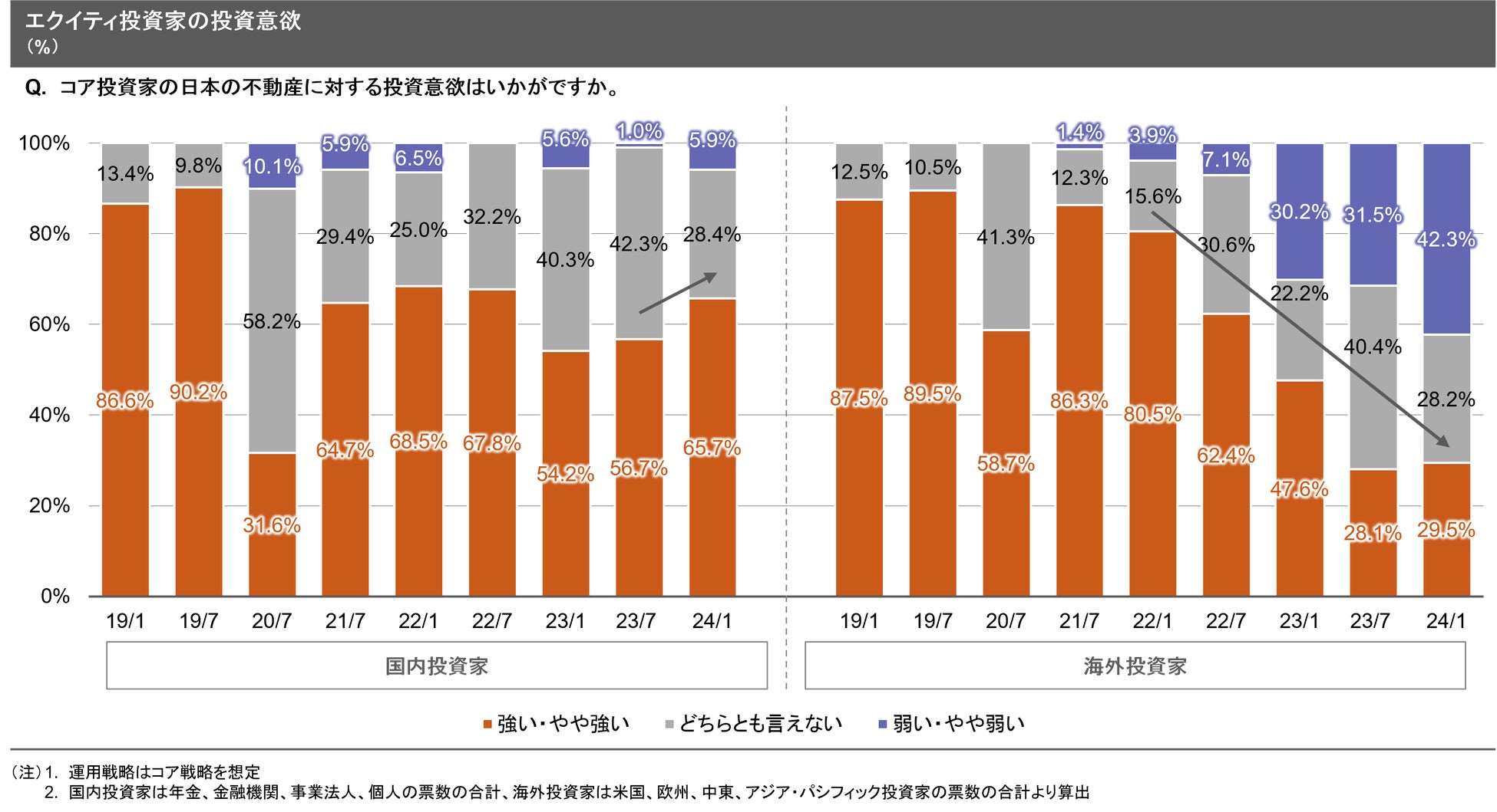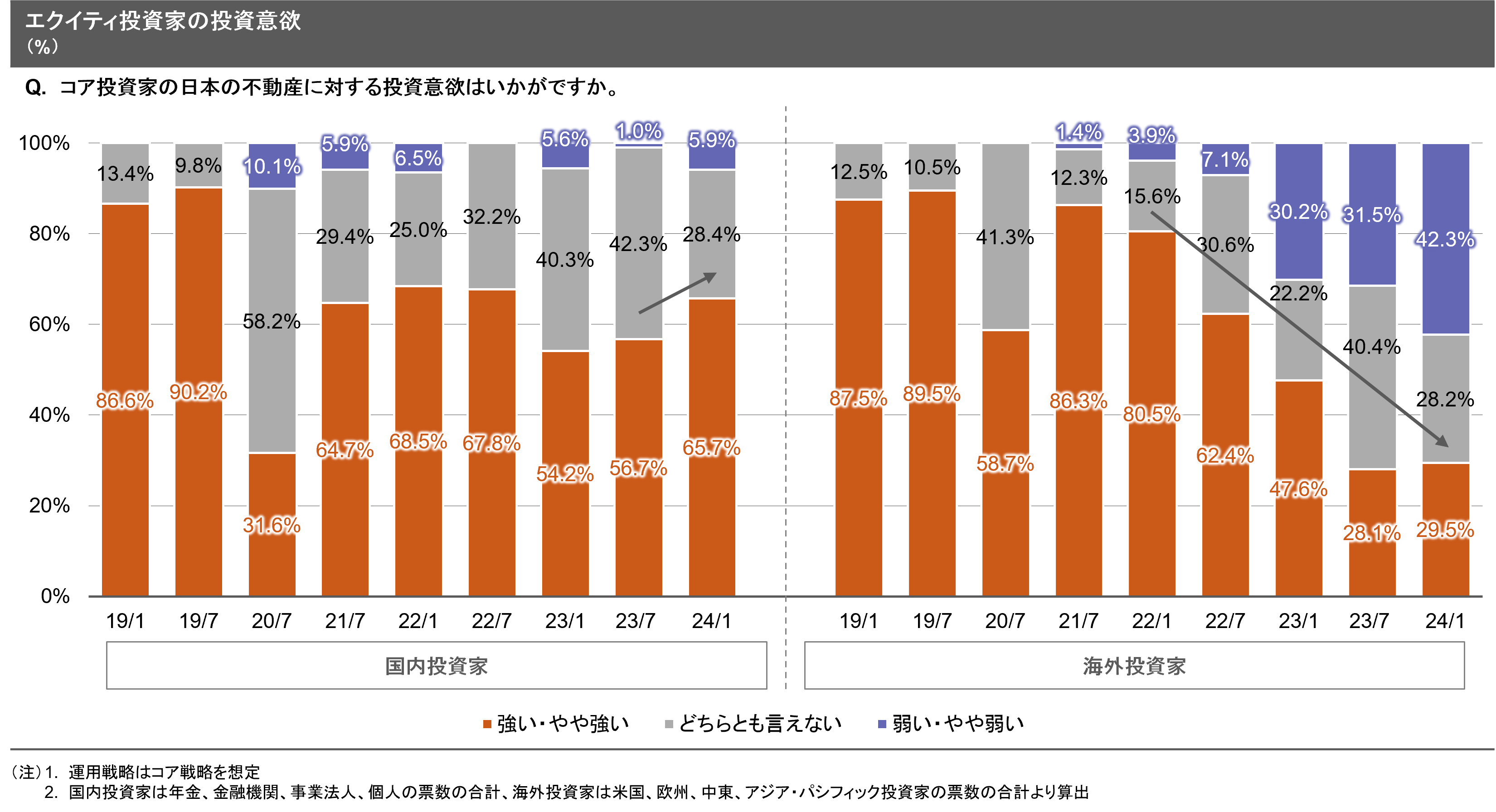 エクイティ投資家の投資意欲については、国内投資家は「強い・やや強い」の回答割合が上昇した一方、海外投資家の同割合は低位のままだった(国内投資家 前回56.7%→今回65.7%、海外投資家 28.1 %→29.5%)