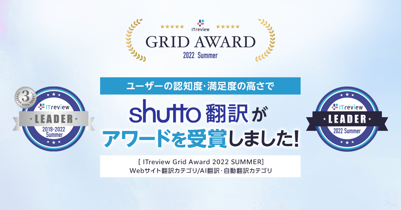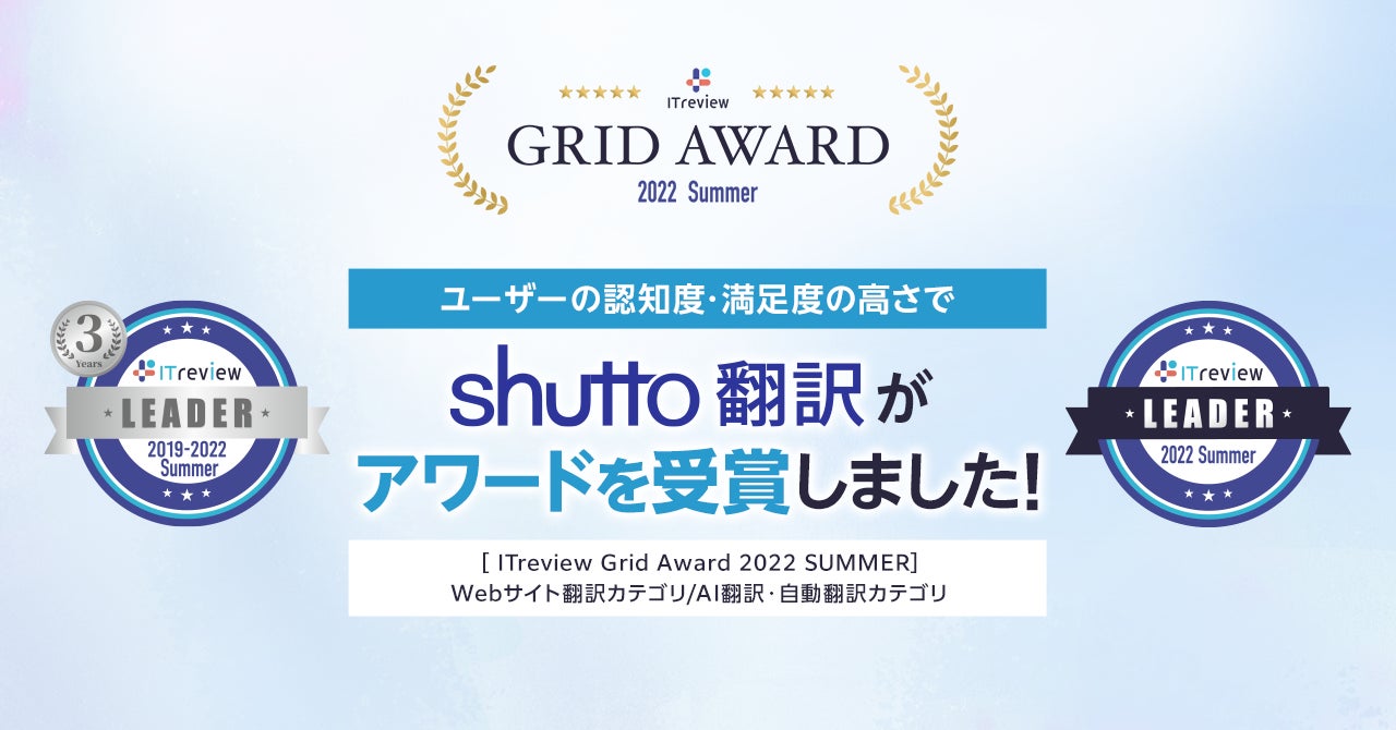 Webサイト翻訳サービス「shutto翻訳」、顧客満足度と認知度の双方が優れた製品として3年連続Leaderの称号を受賞!~「ITreview Grid Award 2022 Summer」