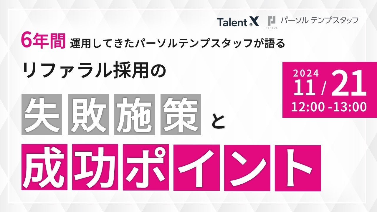 株式会社TalentX(本社:東京都新宿区、代表取締役社長:鈴木貴史)は、パーソルテンプスタッフ株式会社(以下「パーソルテンプスタッフ」)をゲストにお招きして、「リファラル採用の失敗施策とその背景から導く成功ポイント」をテーマにお話しいただく採用マーケティングセミナーを11月21日(木)に開催いたします。