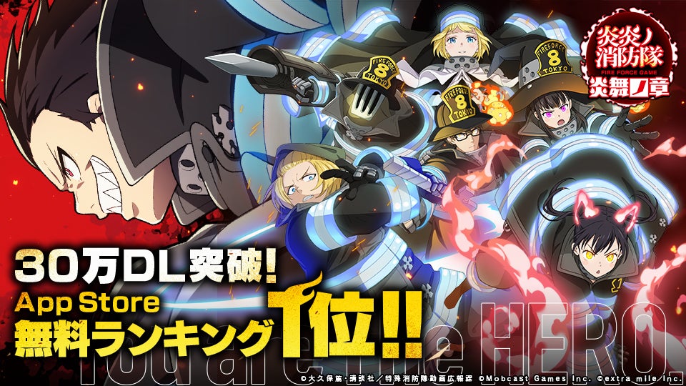 株式会社モブキャストホールディングス(本社:東京都港区、代表取締役CEO 藪考樹)の子会社である 株式会社X-VERSE(※旧社名:株式会社モブキャストゲームス、本社:東京都港区、代表取締役 阪野哲)とextra mile株式会社(本社:東京都港区、代表取締役:玉手栄)は、スマートフォン向けゲーム『炎炎ノ消防隊 炎舞ノ章』が30万ダウンロードを突破いたしましたこと、また併せてApp Storeにて無料ゲームランキング1位を記録したことをお知らせいたします。