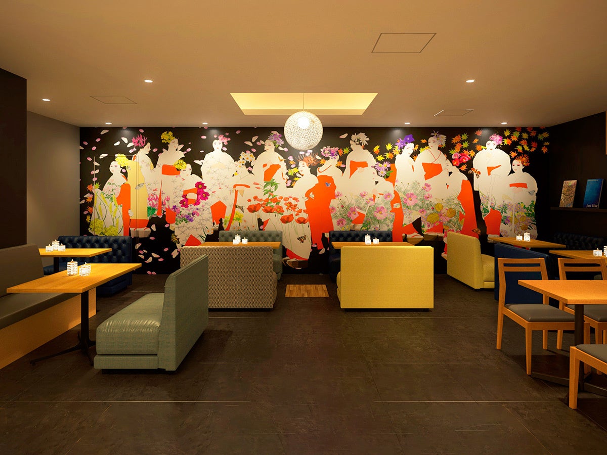 Comfort Library CafeはWi-Fiやコンセント、ブックディレクターが選んだ100冊以上の本をそなえた、宿泊者が無料で利用できるスペースです。2名以上のグループでも利用できるソファ席やボックス席が充実しています。四季をイメージした着物の女性たちが鮮やかに描かれたウォールアートや、短い旅の中でも京都を感じることができる地域工芸品などが取り揃えられたデザイン性の高い空間となっています。