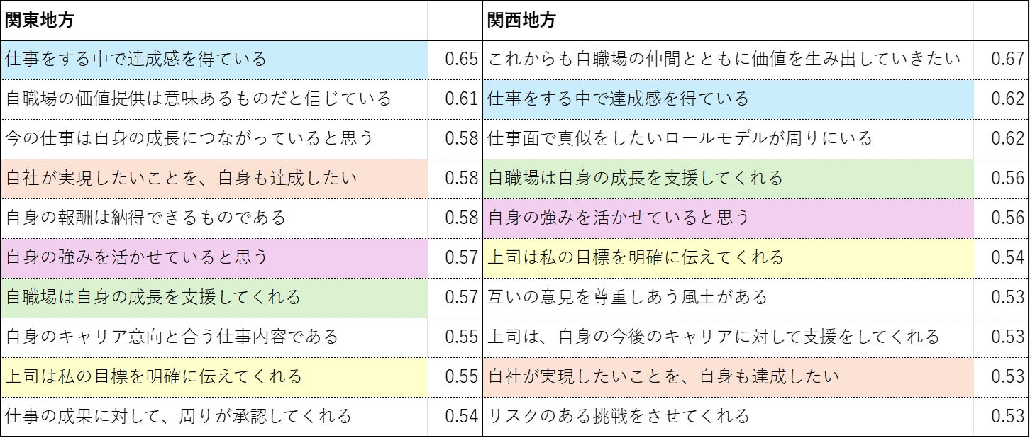 関東地方で働く人の働きがいが上がる要因は、「仕事をする中で達成感を得ている」「自職場の提供価値は意味あるものだと感じている」「今の仕事は自身の成長につながっていると思う」等、仕事の意味や価値、成長についての数値が高い傾向があります。関西地方で働く人は、最も多かったのが「これからも自職場の仲間とともに価値を生み出していきたい」となり、全体の傾向として”仲間とともに””ロールモデル””互いに意見を”など周りと関係しあう項目が「働きがい」の上位にランクインしており、より周囲との人間関係構築を重視している傾向が見られます。