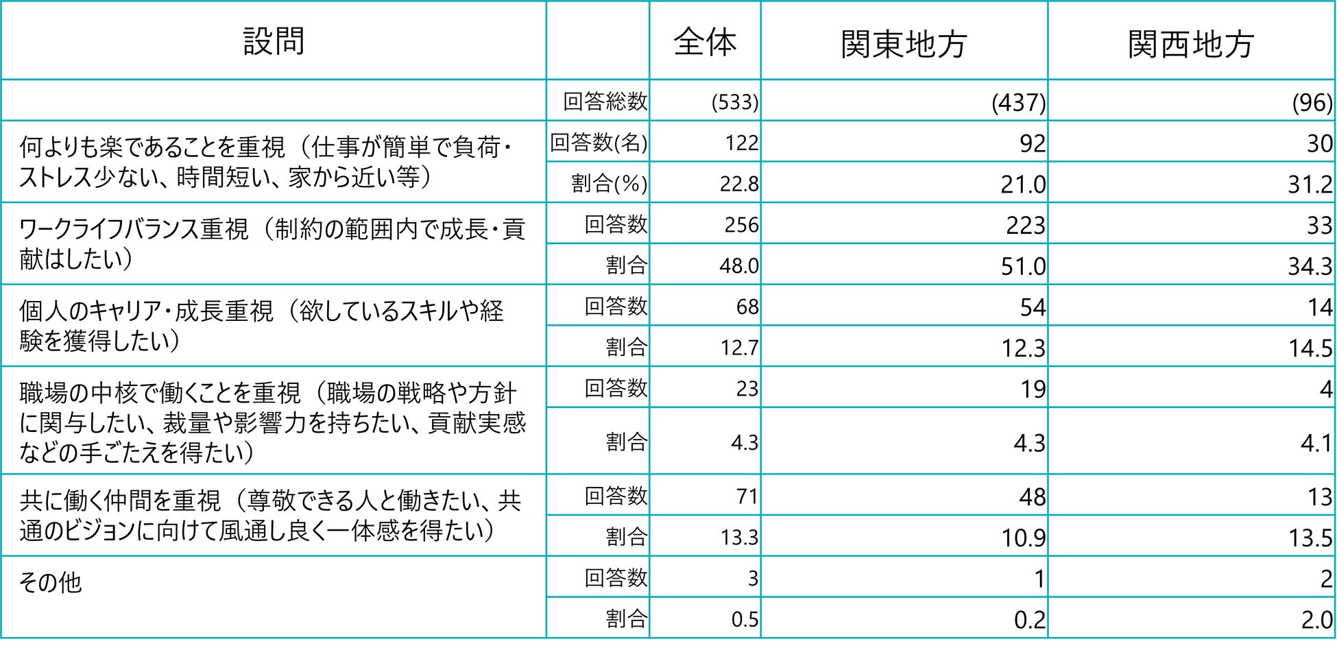 「ワークライフバランスを重視する」という選択をしている方が関東地方で51%に対して関西地方は34%となっており、比較すると割合が少ないことが分かりました。また、「何よりも楽であることを重視」という設問においても、差が見られました。関東地方で働く人が21%の回答だったことに対して、関西地方で働く人は31%の人が仕事において、「負荷・ストレスが少ない」「時間が短い」「家から近い」ことを重視しているという結果となりました。