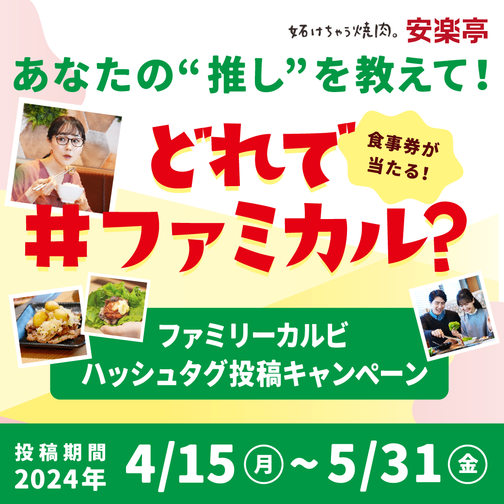 2024年4月15日(月)~5月31日(金)の期間、「ファミリーカルビ」をさらに多くの方に楽しんでいただくため、安楽亭から新しい3つのアレンジを提案するとともに、みなさん自身のファミリーカルビの楽しみ方をシェアしていただく「ファミリーカルビ ハッシュタグ投稿キャンペーン」を開催します。