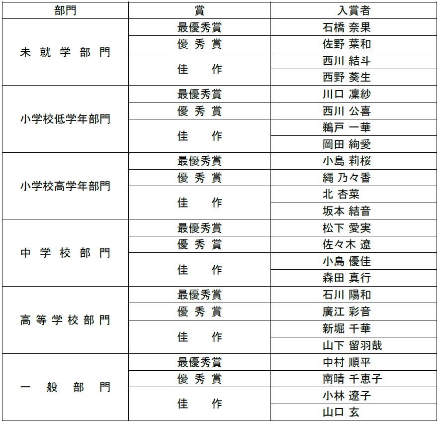 【募集部門】 未就学部門、小学校低学年部門、小学校高学年部門、中学校部門、高等学校部門、一般部門