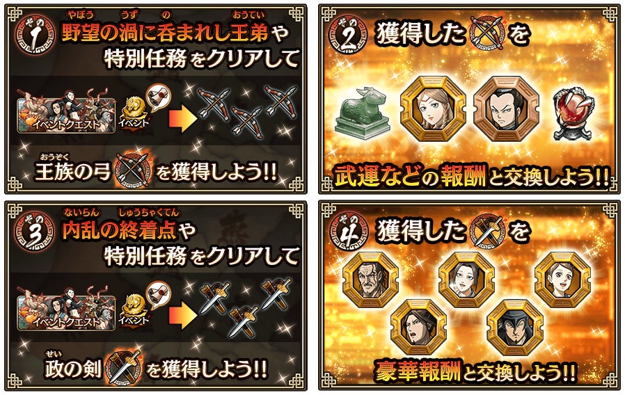 開催中のイベント『王と弟』のイベントクエストに、指定された武将を編成すると、交換用アイテムが追加でドロップ!報酬アイテムへの交換が容易になります!