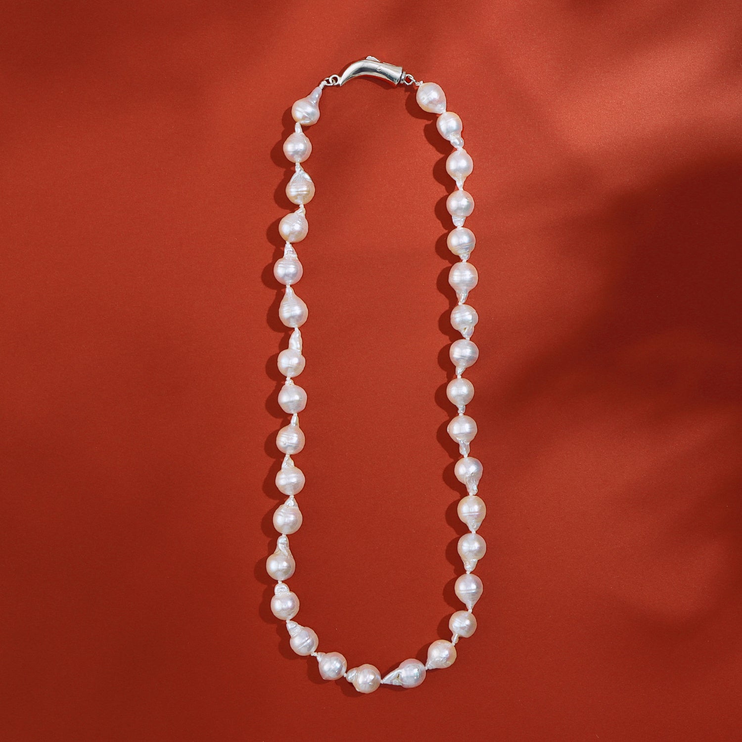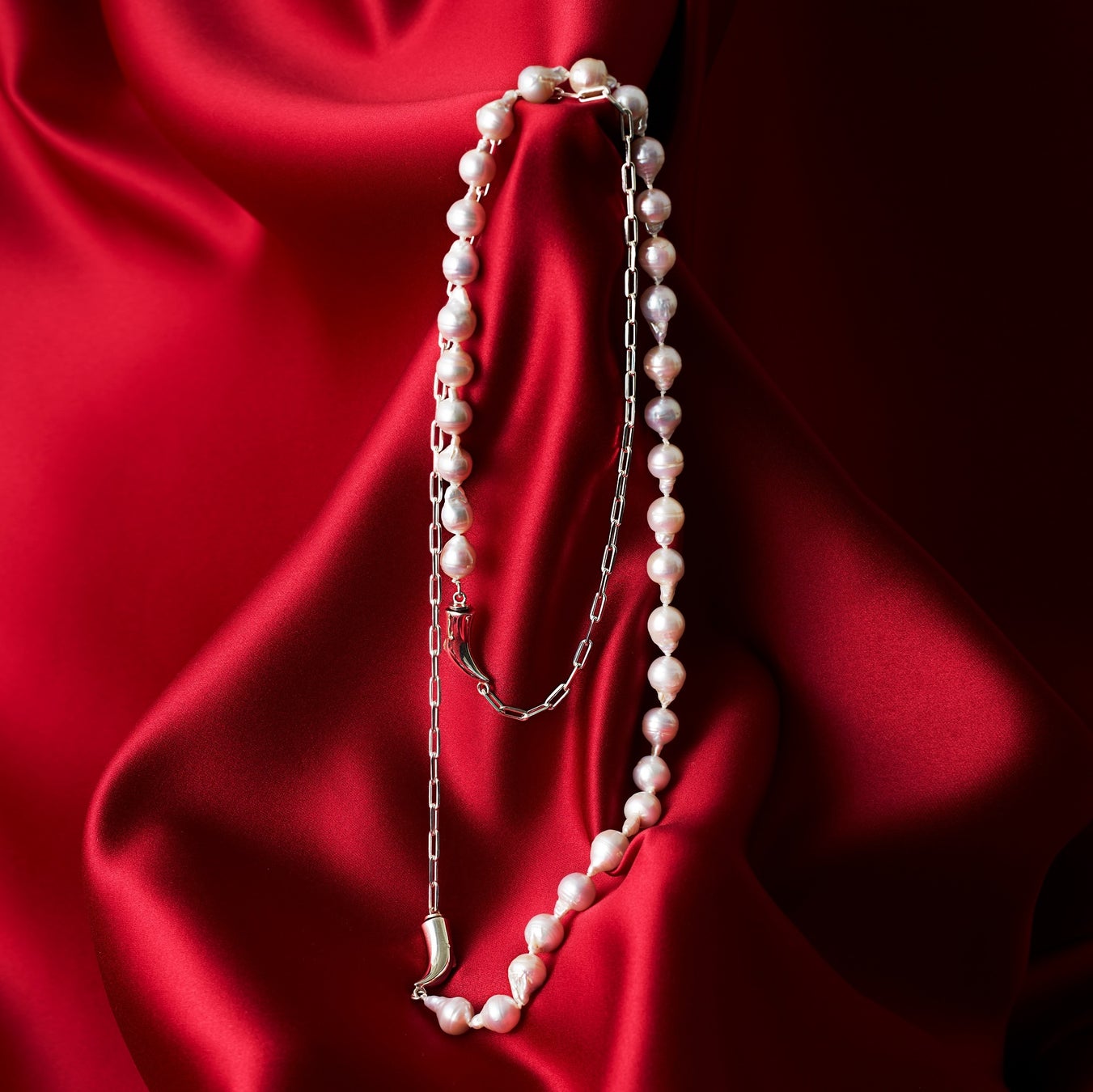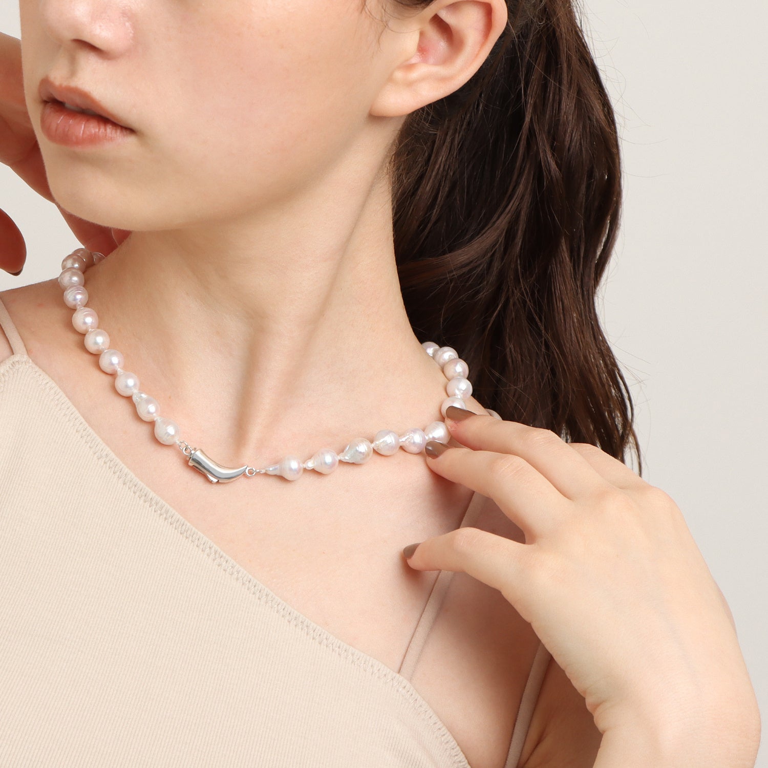 個性豊かな淡水バロックパールとオリジナルのホーンモチーフクラスプを組み合わせた、リュクスなネックレス。