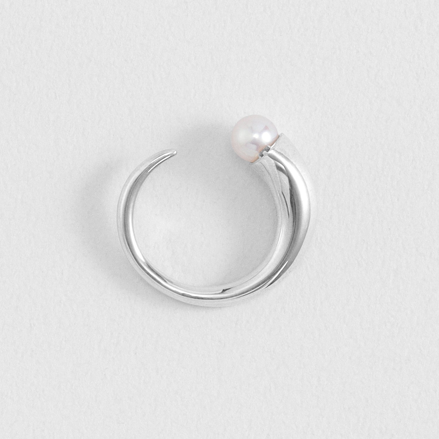 オブジェのような存在感のあるホーンモチーフに、アコヤパールをセッティングしたリング。