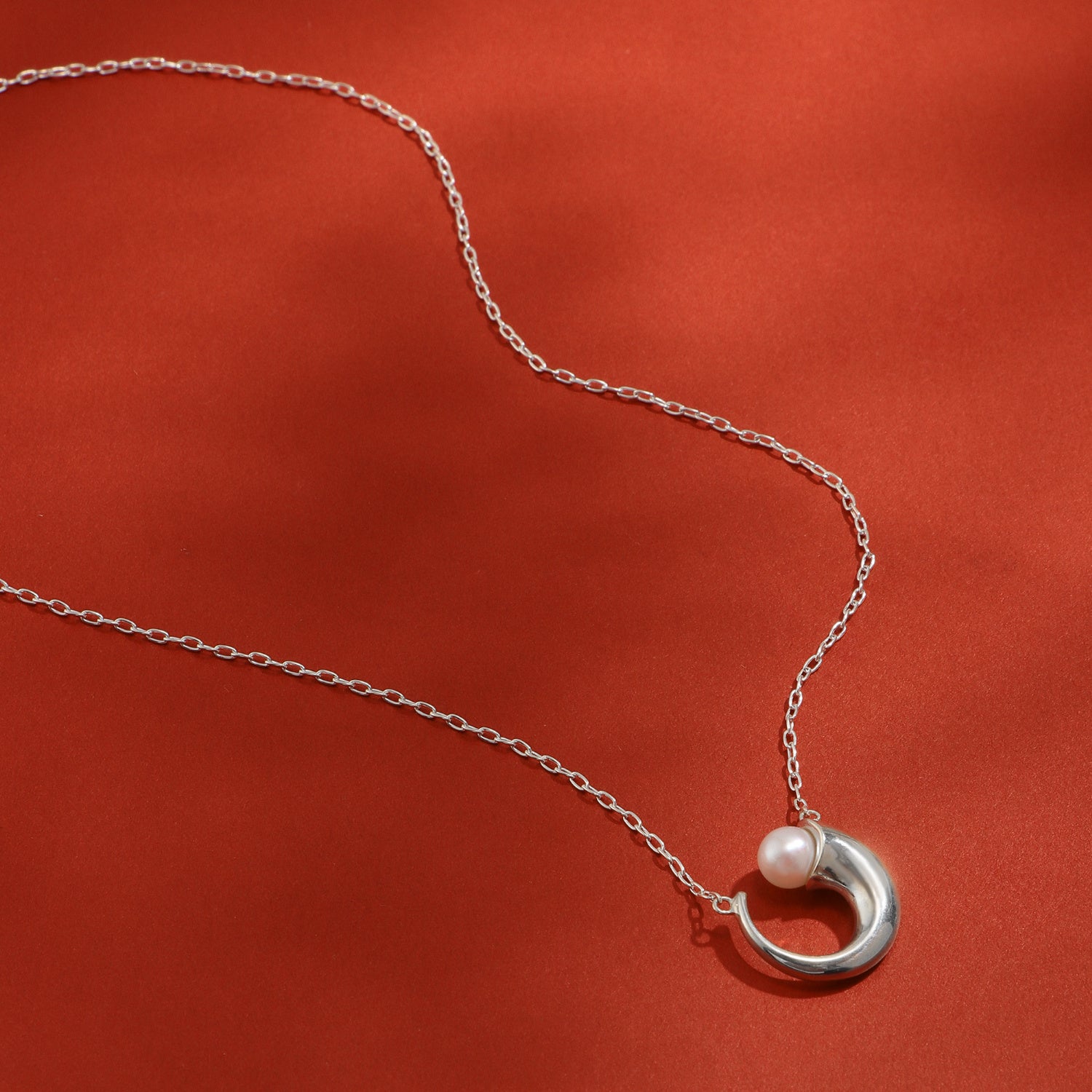 オブジェのような存在感のあるホーンモチーフに、アコヤパールをセッティングしたネックレス。