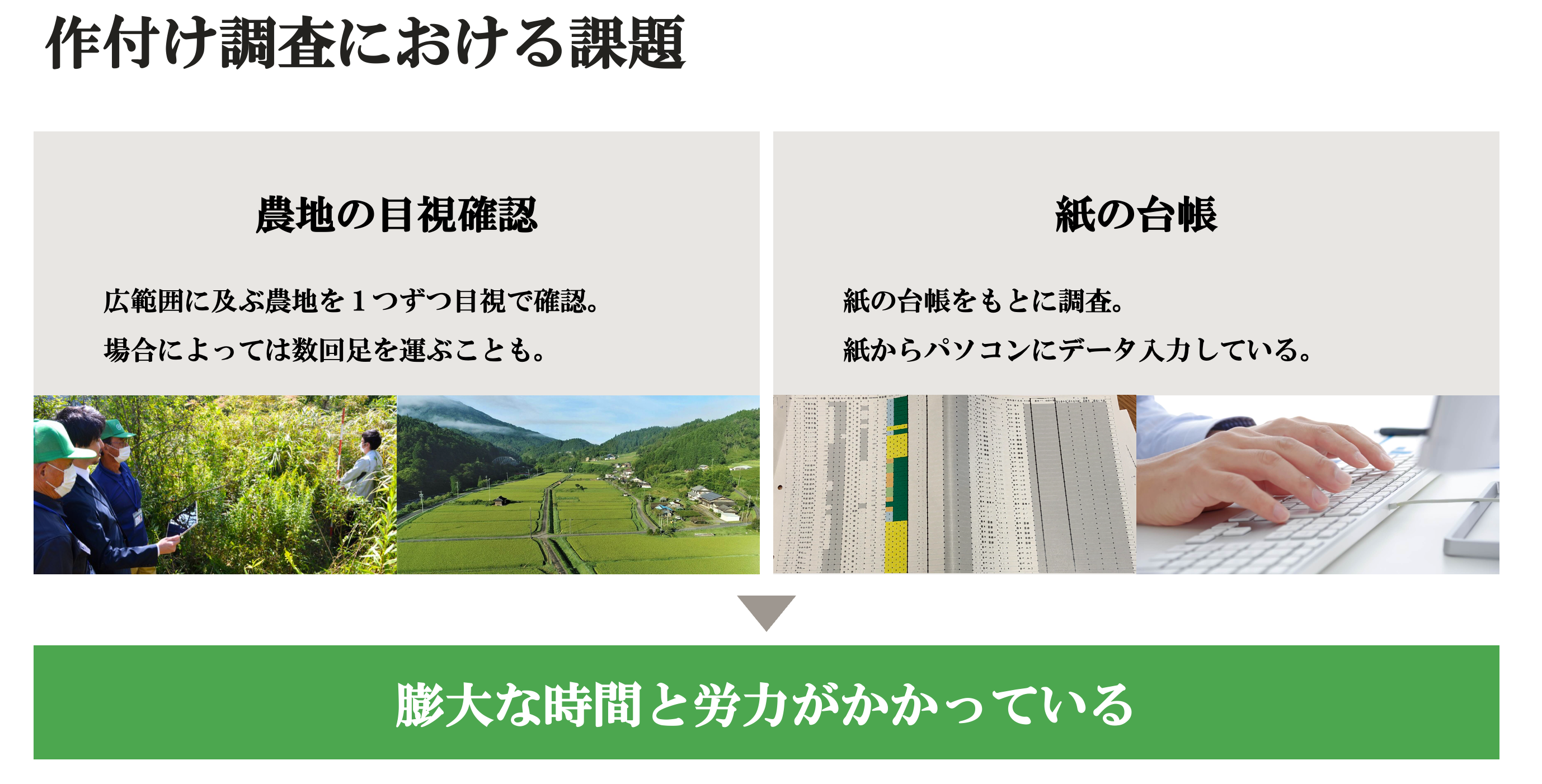 作付け調査は、農地において紙台帳の通り作付けがされているかどうかを調査するものです。大鰐町では、紙台帳をもとに調査を行い、広範囲に及ぶ農地を1つずつ目視で確認しなければなりませんでした。そのため、場合によっては数回足を運ぶことになり、大きな負担のかかる作業でした。また、調査後も、紙の台帳からパソコンにデータを入力する必要があるため、さらに膨大な労力がかかります。