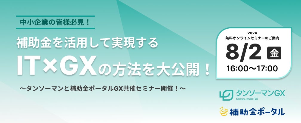 株式会社補助金ポータル(本社:東京都渋谷区、代表取締役:福井彰次)と株式会社タンソーマンGX(本社:東京都港区、代表取締役:福元惇二)は、2024年8月2日(金)に中小企業の皆様必見!補助金を活用して実現するIT×GXの方法を大公開!」と題して無料オンラインセミナーを開催いたします。無料でご視聴いただけますので、ぜひご参加ください。