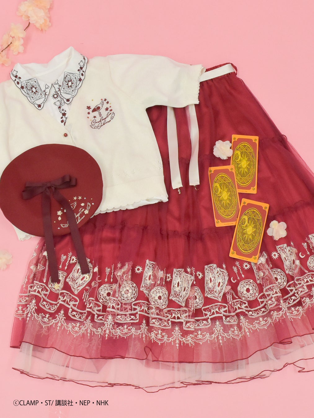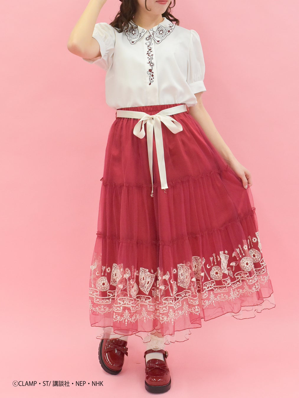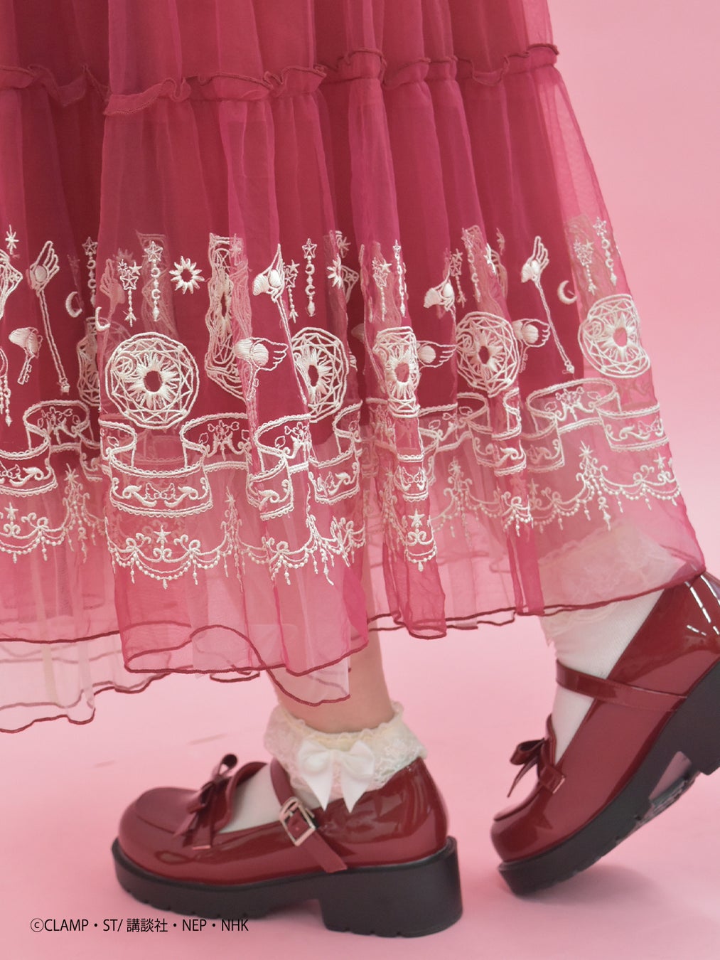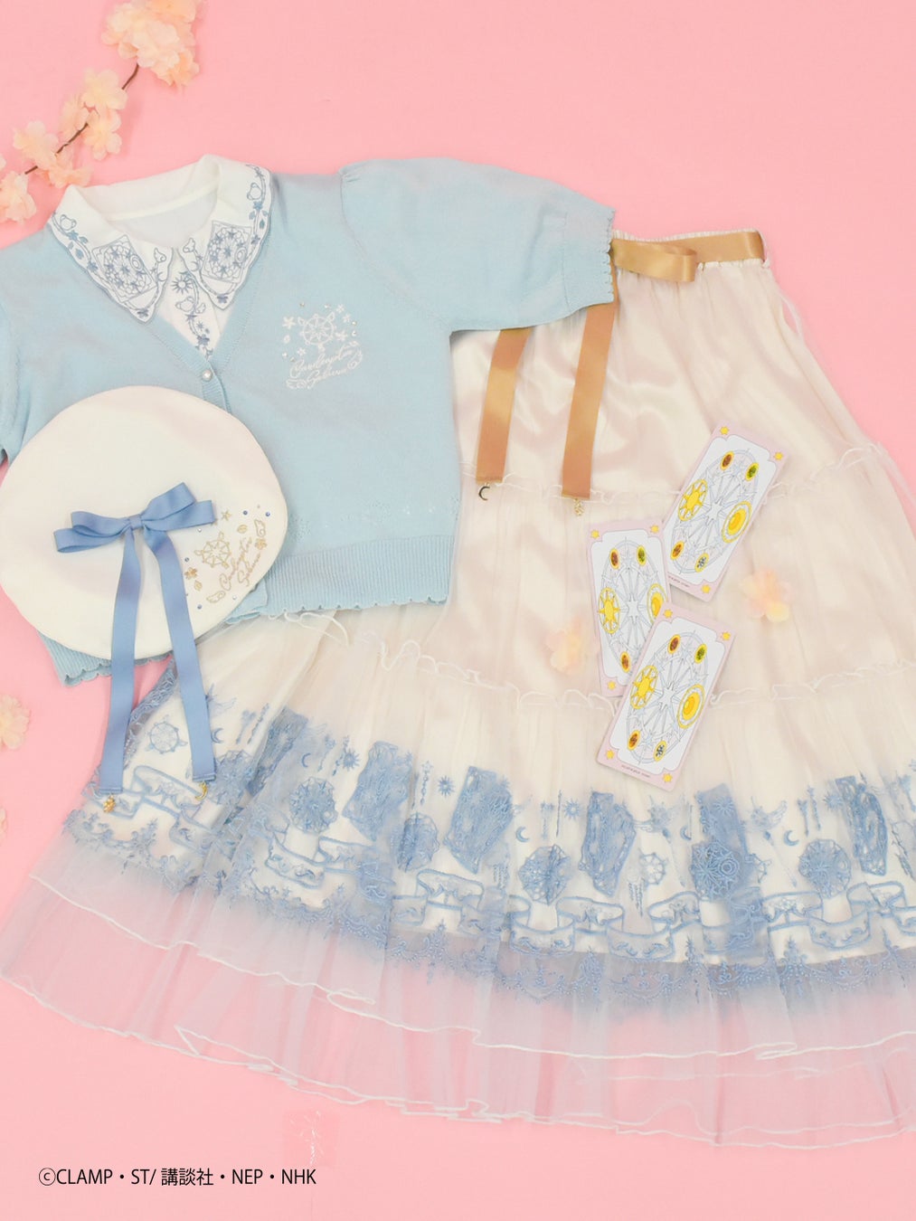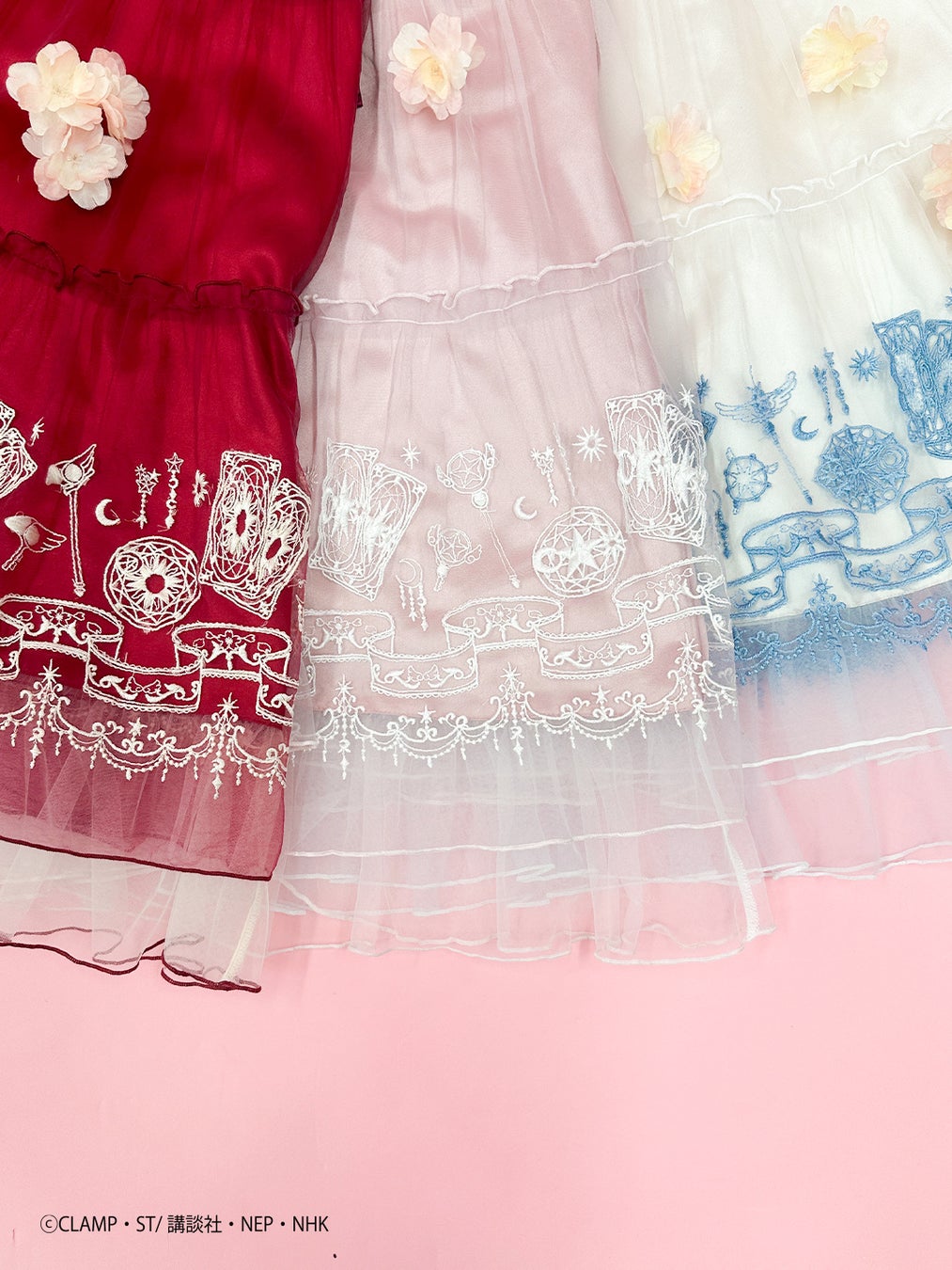 アニメオープニングのコスチュームカラーをイメージし、「クロウカード」「さくらカード」「クリアカード」のそれぞれのカード・杖・鍵・魔法陣のデザインを刺繍で落とし込んだチュールティアードスカート。