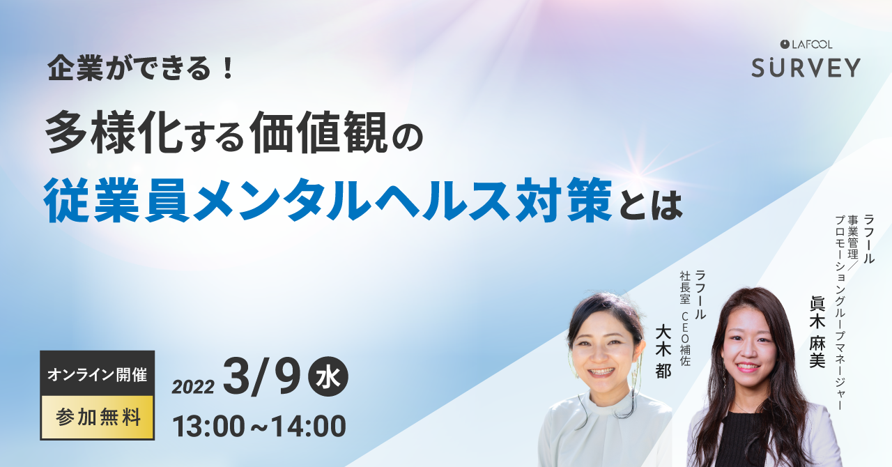 「個人が変われば、 組織が変わる」組織改善サーベイ『ラフールサーベイ』を提供する株式会社ラフール(本社:東京都中央区、代表取締役社⻑:結木啓太、代表取締役副社長:小梨明人、以下「ラフール」)は、『企業ができる!多様化する価値観の従業員メンタルヘルス対策とは』をテーマとしたオンラインセミナーを2022年3月9日(木)に開催します。
