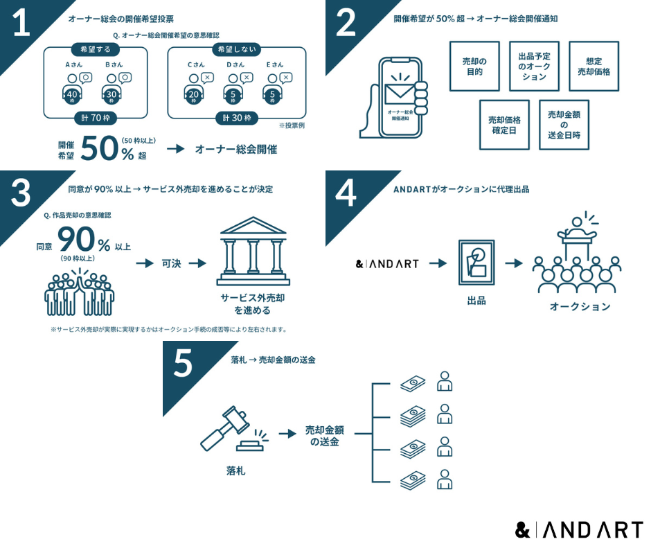 オーナー総会で50%超(総枠数の50%超の枠数)の賛成が得られた場合、共同保有作品のサービス外売却を進めることが決定され、ANDARTが代理でオークションに出品いたします。