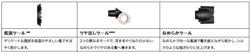 拡散された風でやさしく乾かす「低温ツール」、2つの異なるモードで浮き毛やうねりの少ないまとまりのある髪に仕上げることができる「ツヤ出しツール」、均一な風速で髪をそろえながら乾かし、指ざわりのいい髪に仕上げる「なめらかツール」の3種類のアタッチメントが付属します。